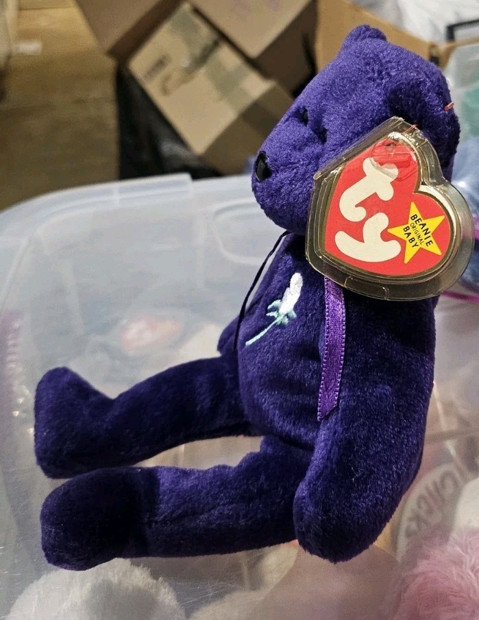как выглядит 1997 TY BEANIE BABY PRINCESS DIANA PURPLE TEDDY BEAR W/ WHITE ROSE CLEAN фото