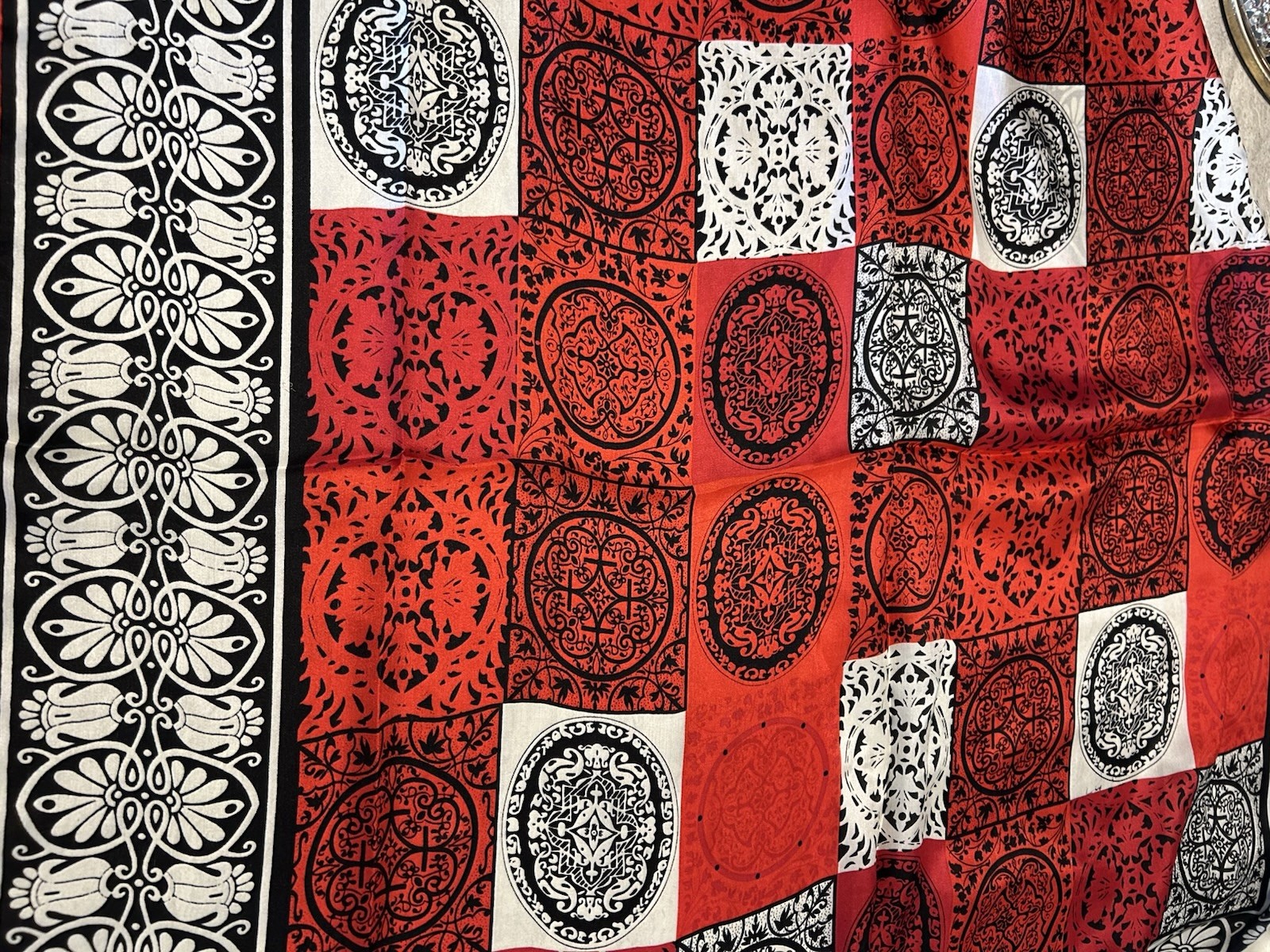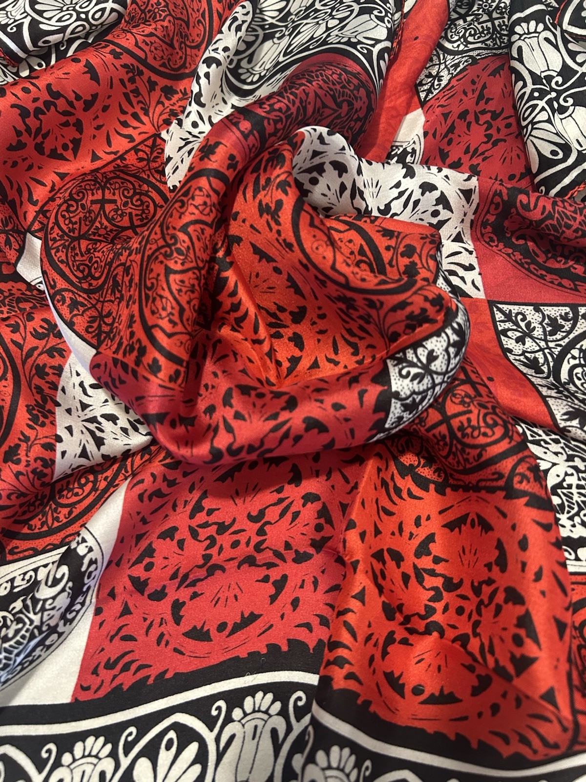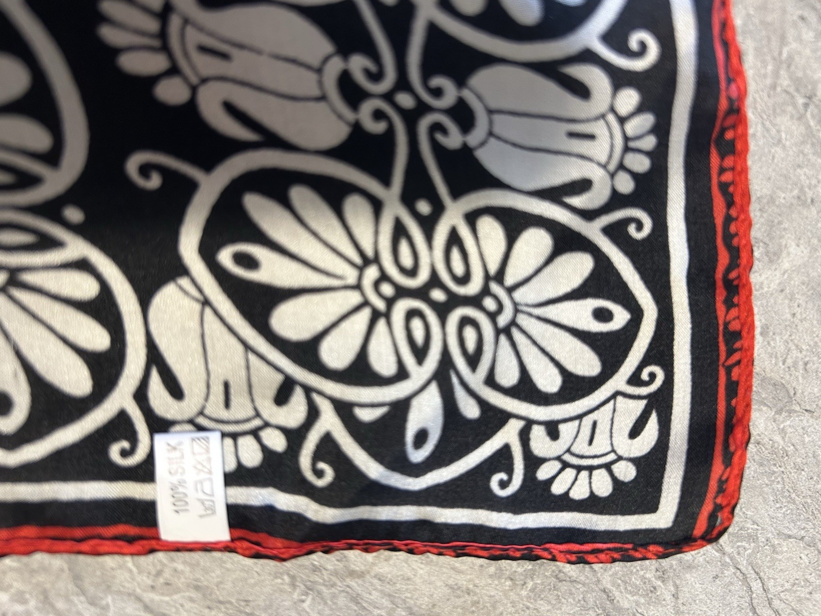 100 silk Red Blk White Fluoride handmade women's silk Square scarf 33 X32 Vtg