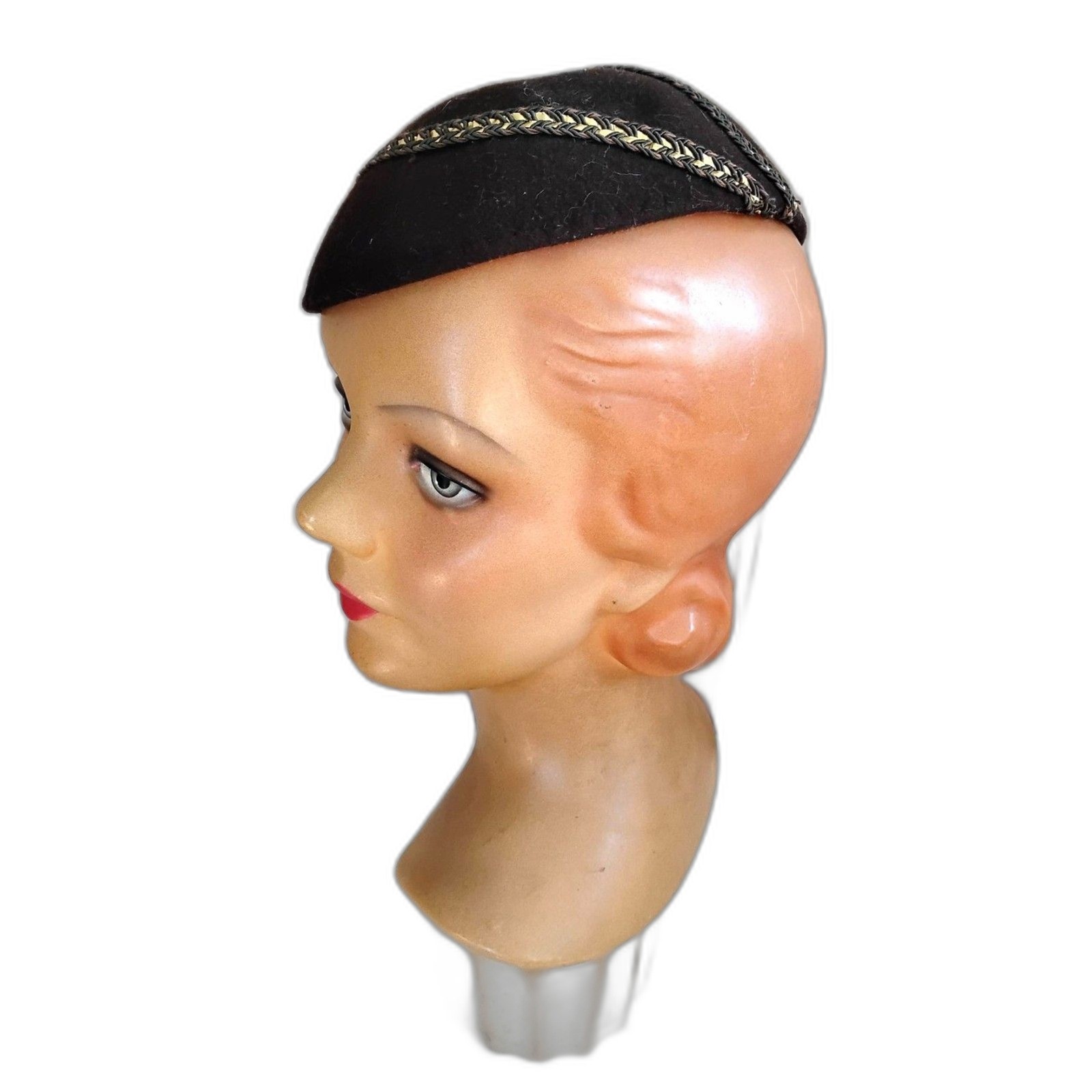 как выглядит 1940s Vintage New York Creation Brown Felt Skullcap Hat with Gold Braid фото