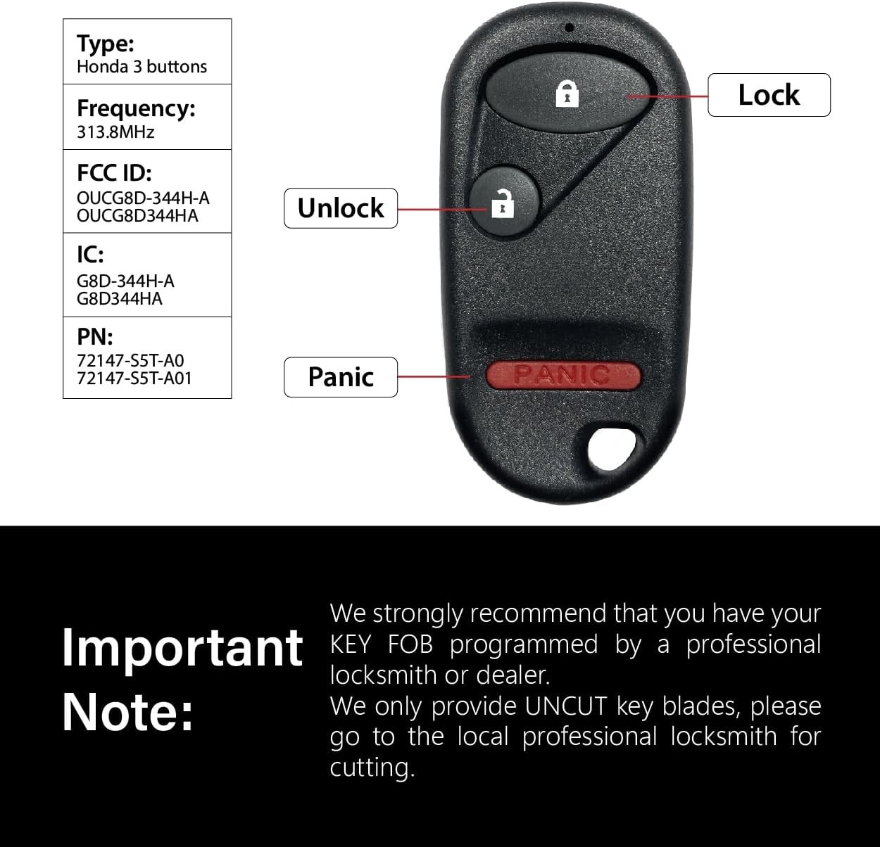 Key Fob Remote Keyless Entry Control 313.8MHz 3 Button Replacement for 2002-2011