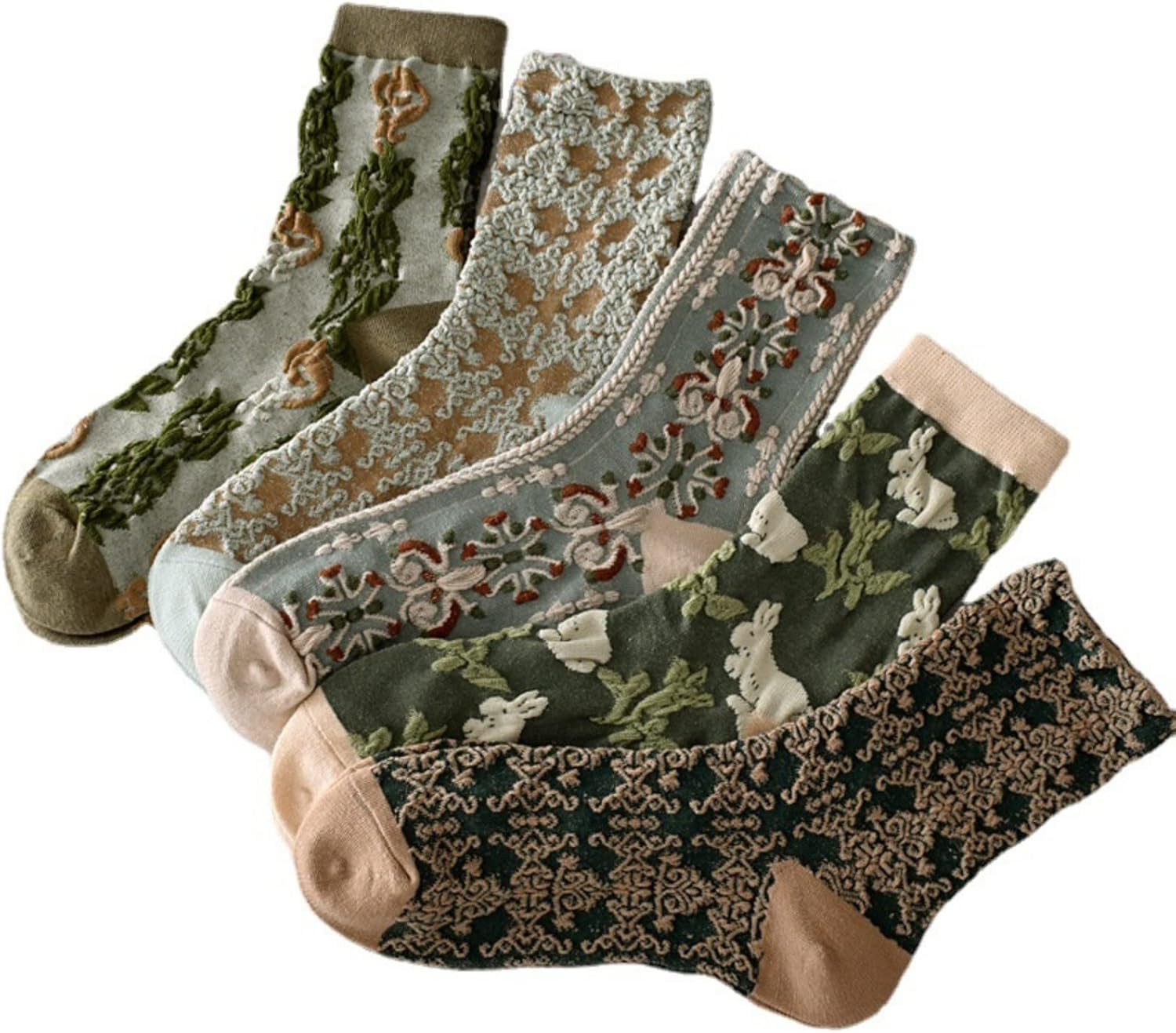 5 Pairs Womens Floral Cute Socks Vintage Embroidered Plant Socks for Women Teens