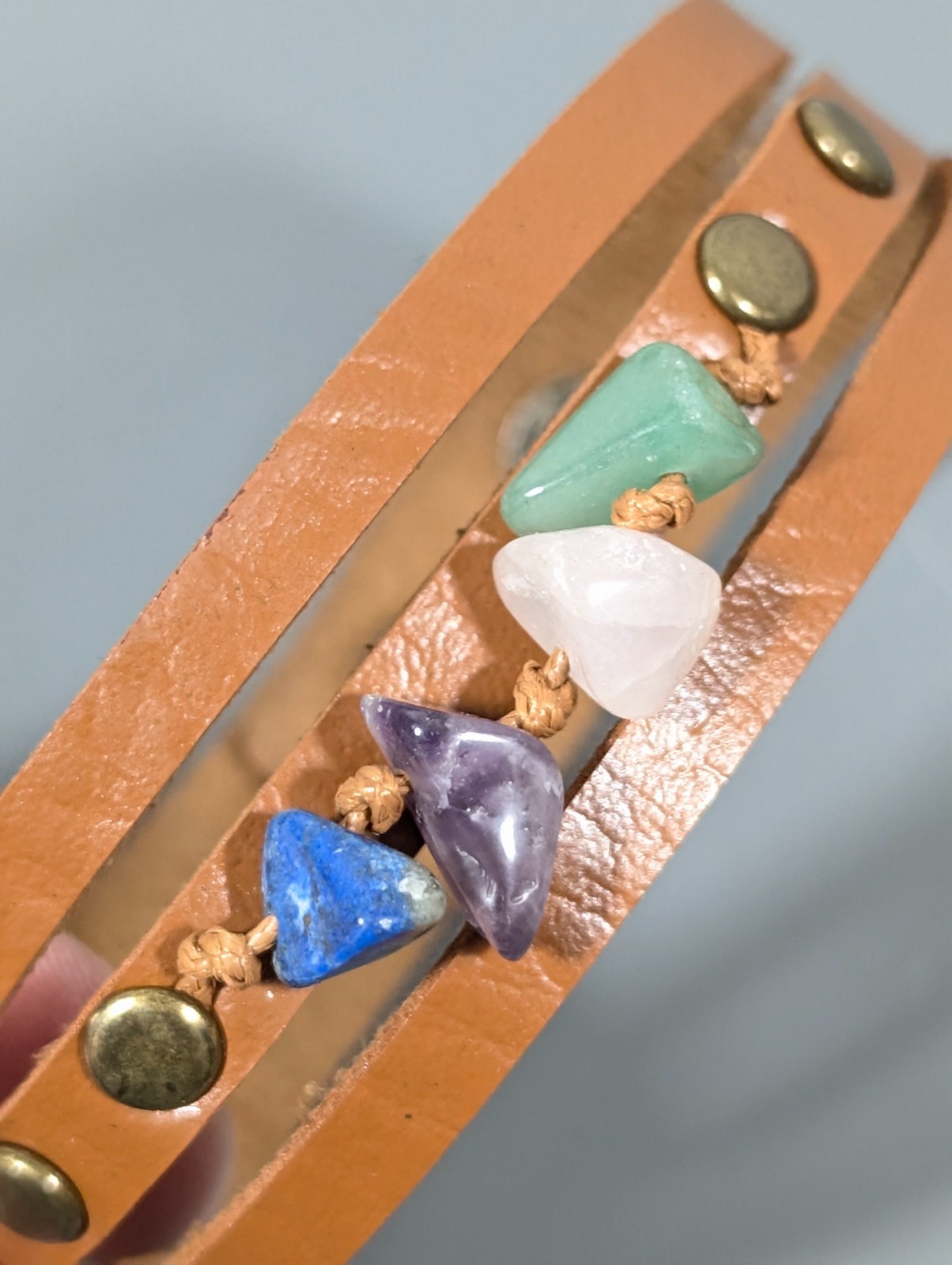 как выглядит Beachy Boho Purple Green Stone Brown Faux Leather stud Snap Cuff Bracelet 7.5 in фото