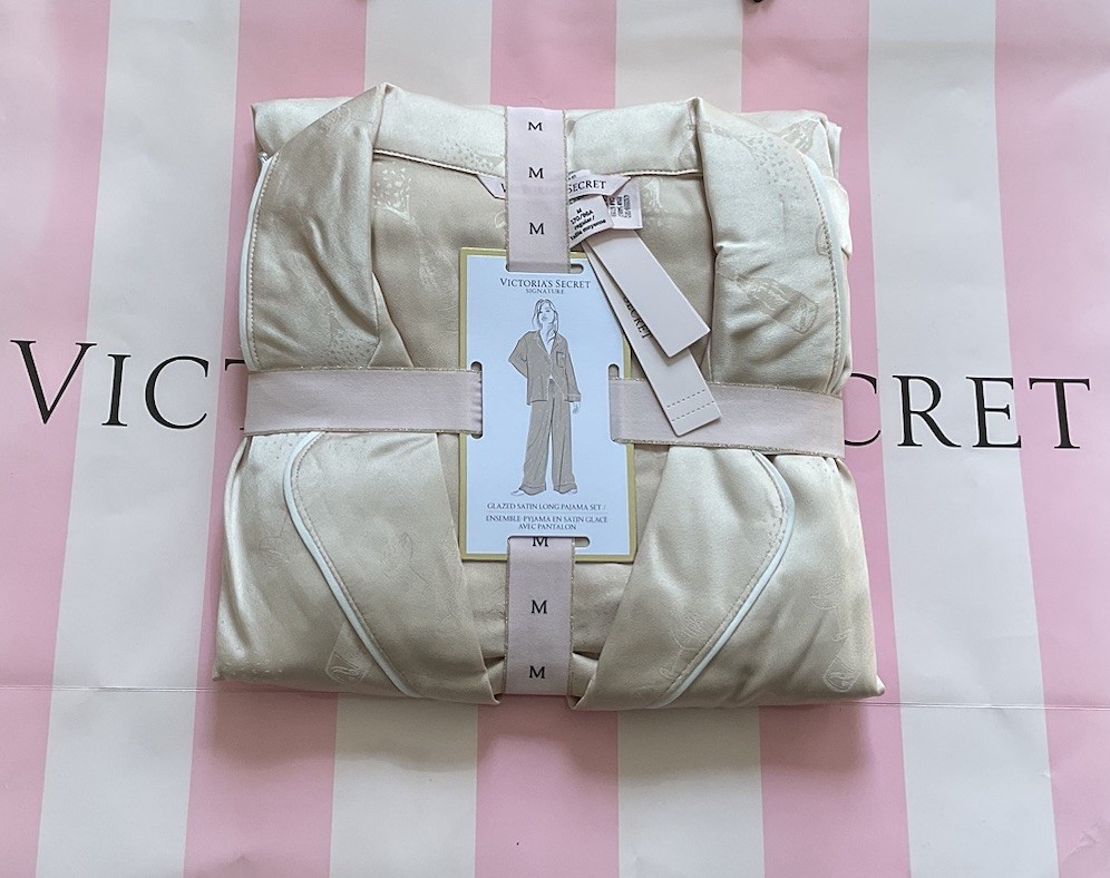 как выглядит NEW Victoria s Secret Glazed Satin Long Pajama Set Pants Top Champagne Toast M фото