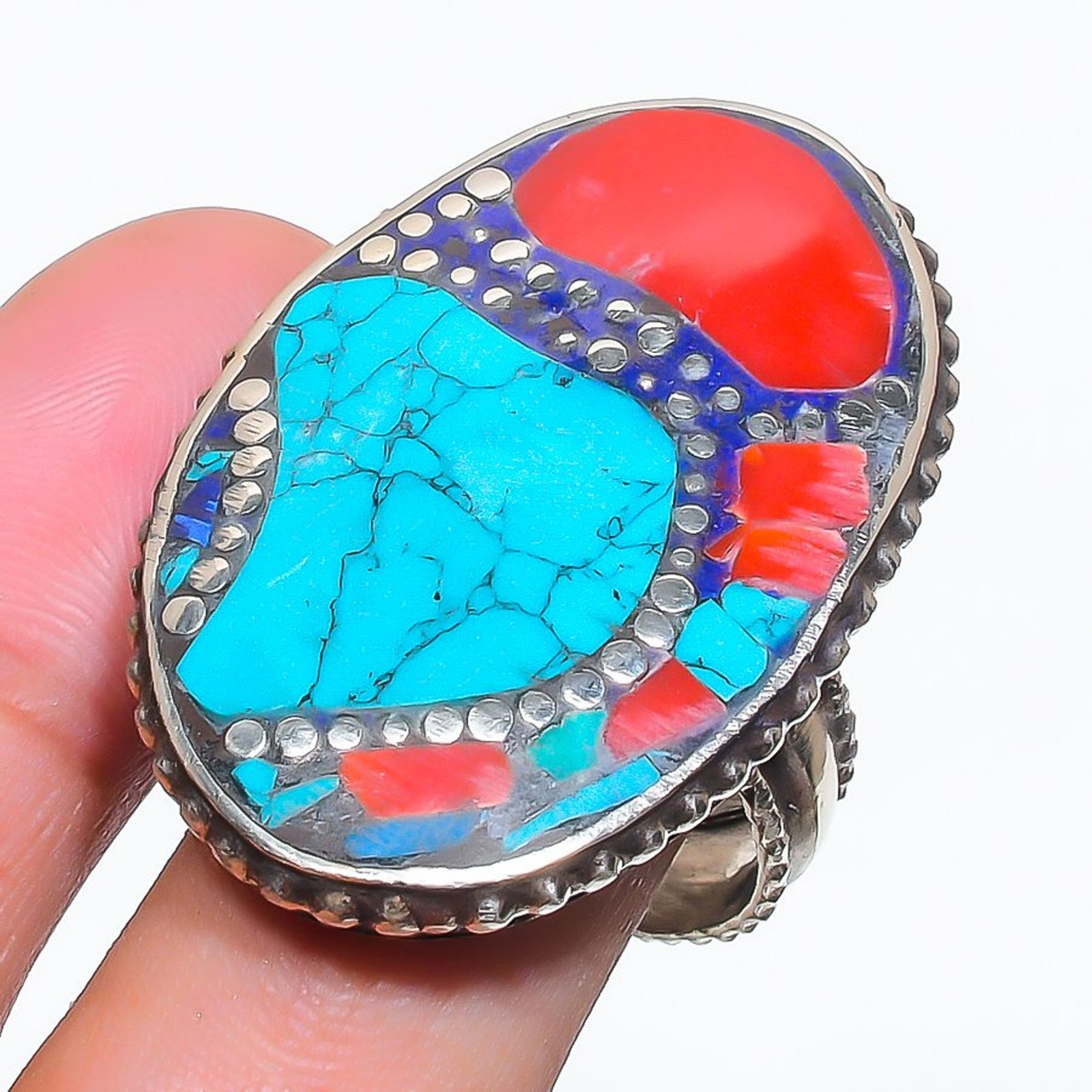 Tibetan Turquoise Red Coral Handmade Boho Nepali Jewelry Adjustable Ring SR 3389