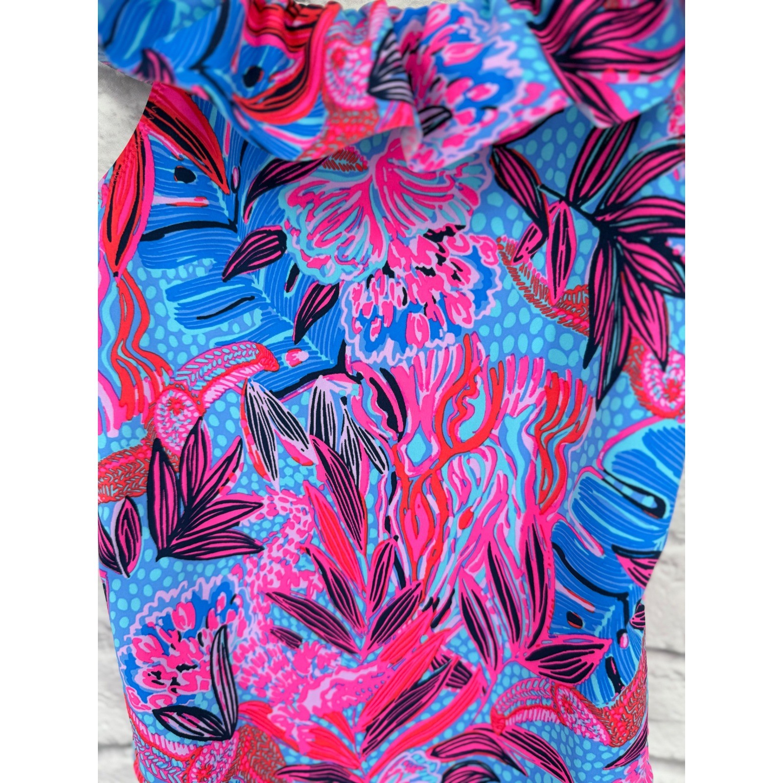 Lilly Pulitzer Girls Pink Blue Tropical Floral Ruffle One Piece Swimsuit Size 12