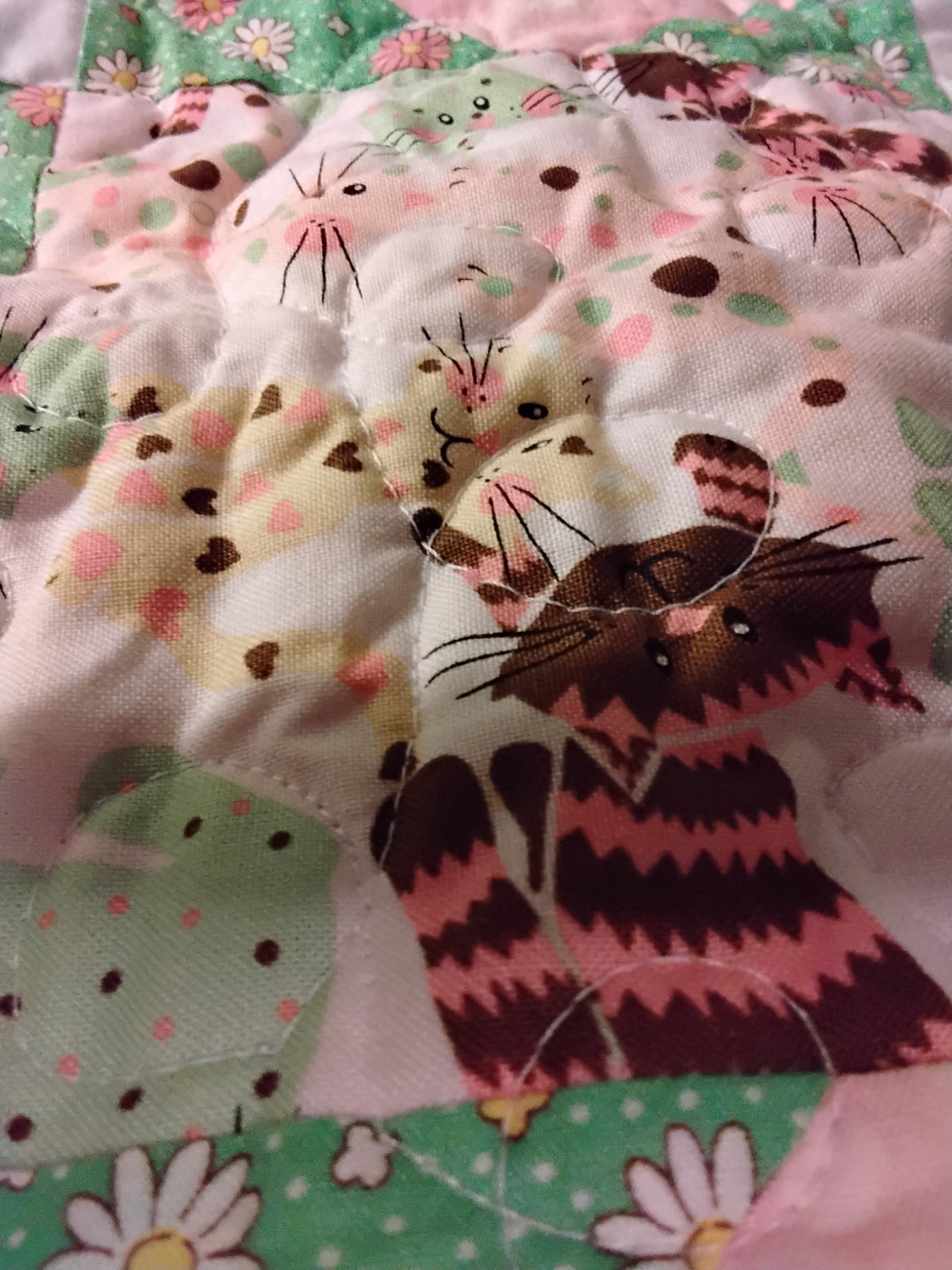 как выглядит Pastel Quilt Star..pink Green Crib Size With Kitties And Flowers Home Made фото