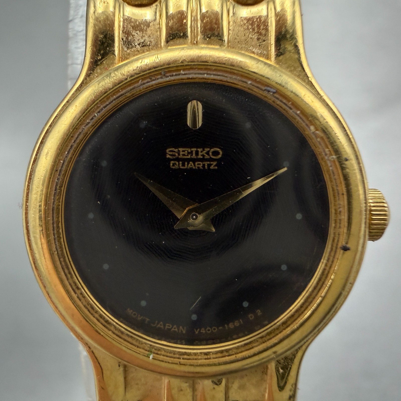Seiko Watch Women 19mm Black Dial gold Tone Round V400-0538 New Battery Vintage
