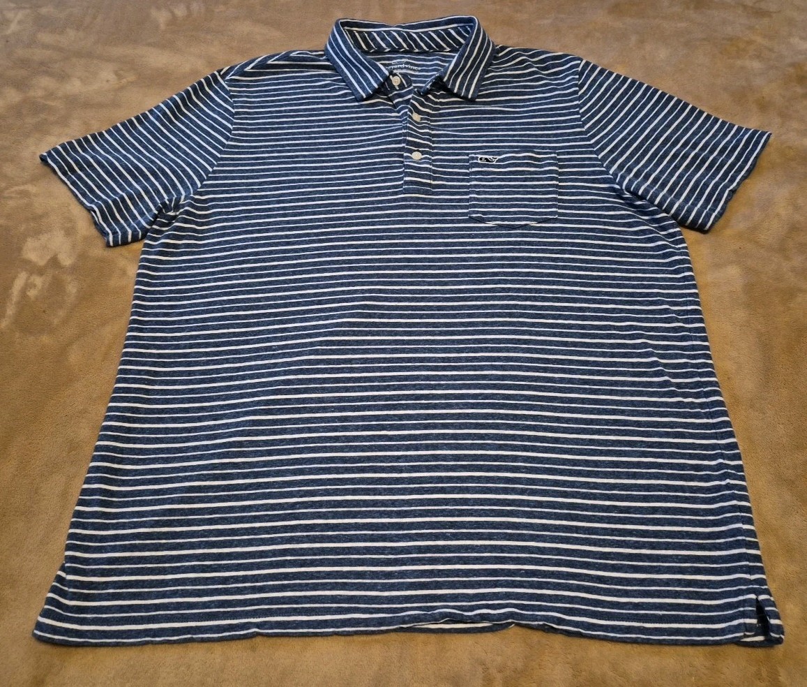 как выглядит Vineyard Vines mens polo shirt LARGE Blue White stripe short sleeve pocket linen фото