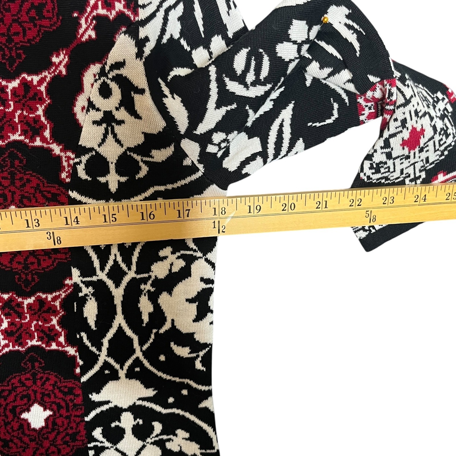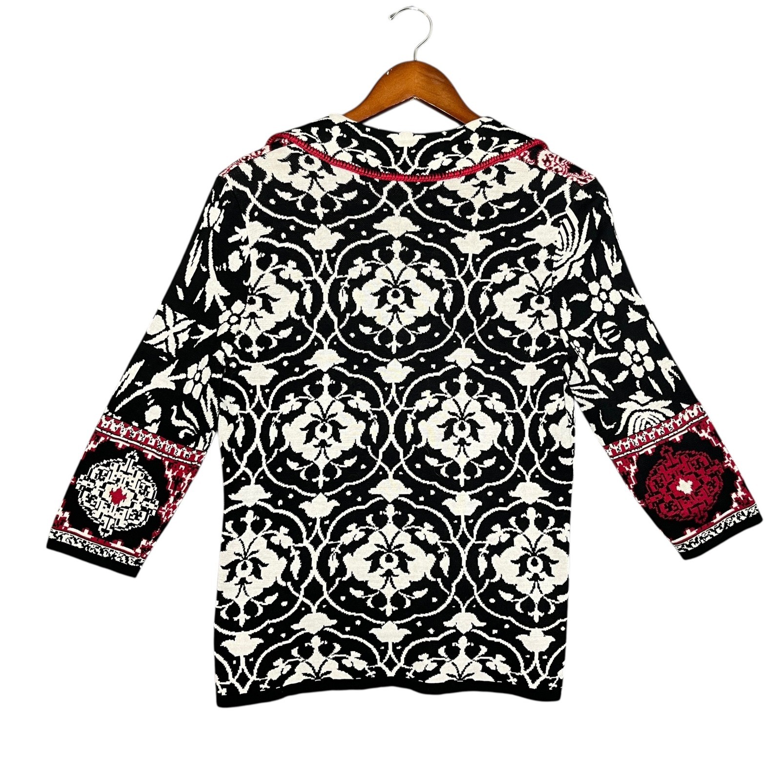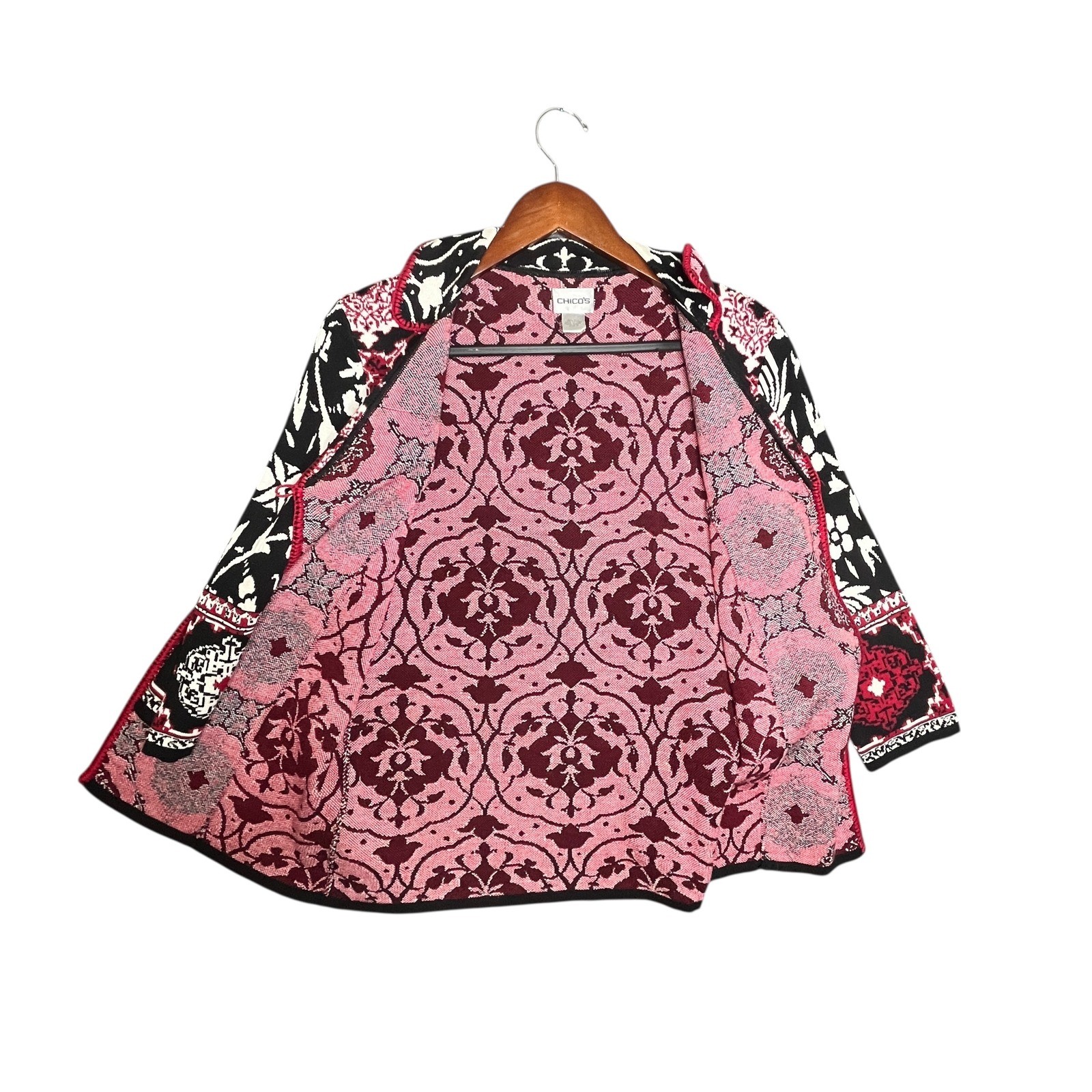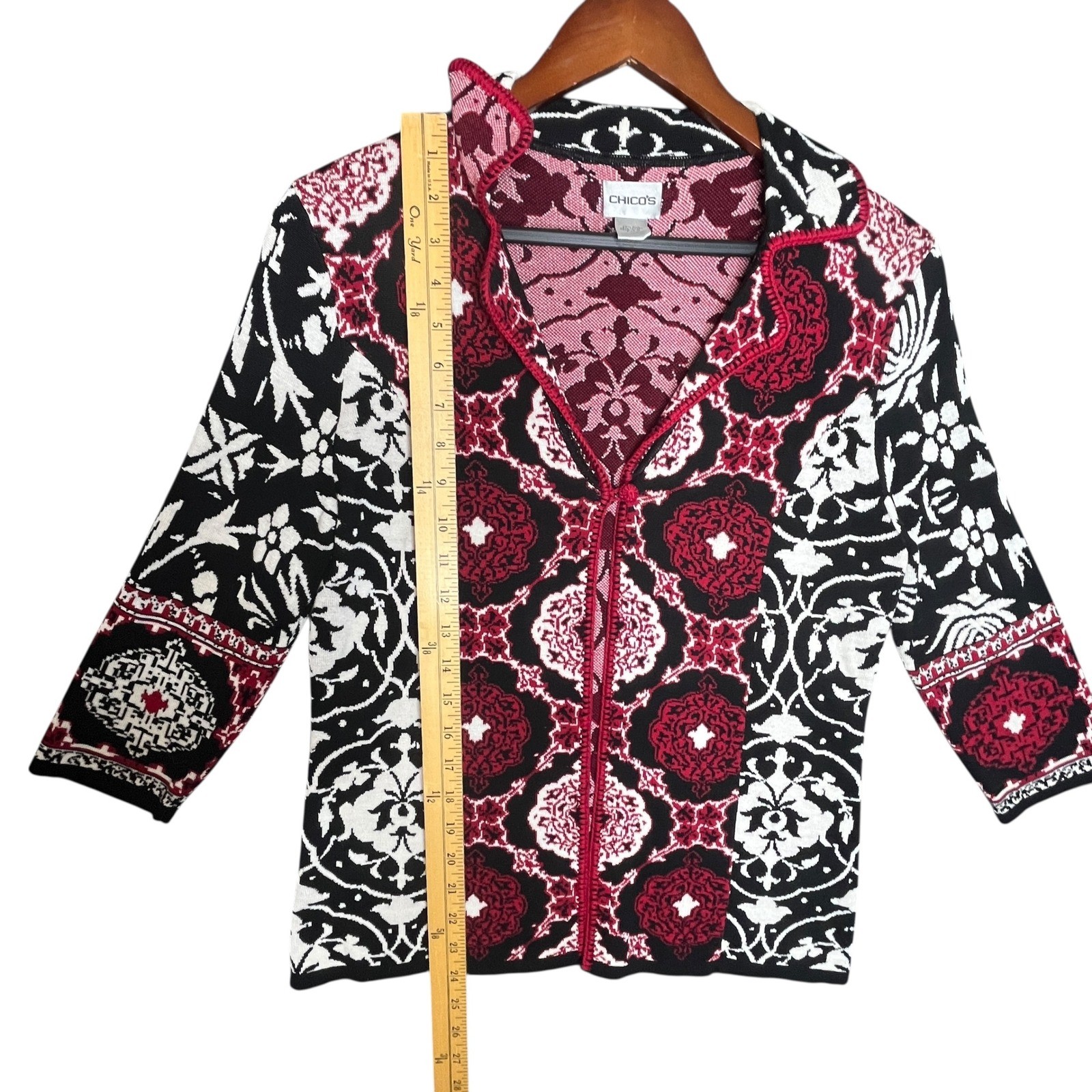 Chicos Silk Cotton Jacquard Knit Cardigan Sweater Jacket Black Red Sz 0 US 4