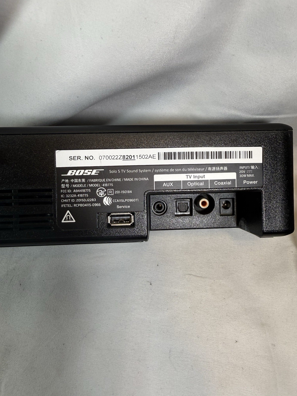 Bose Solo TV Sound System 418775 Soundbar w/ Power Cord-- No Remote