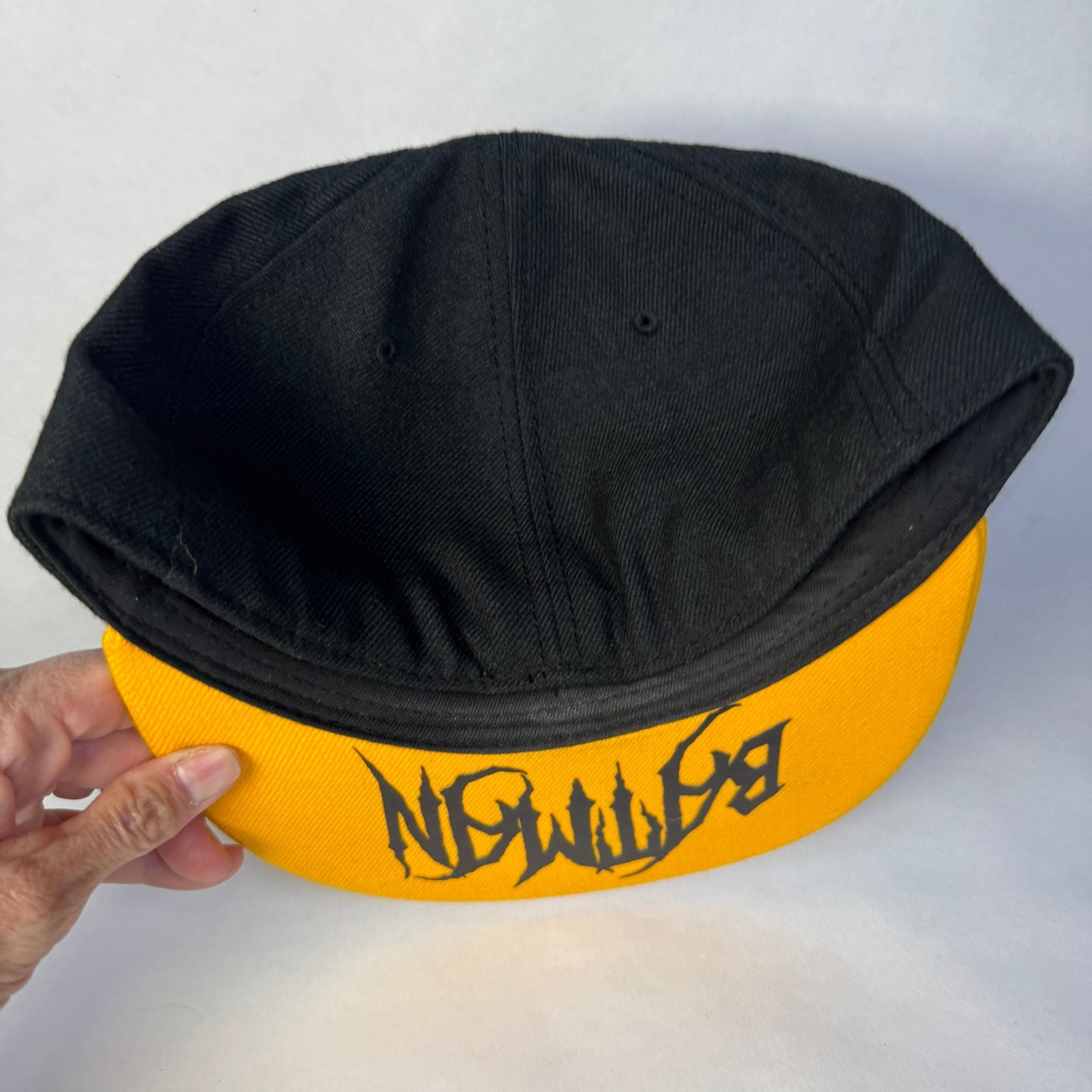 как выглядит Batman Hat DC Comics Mens S/M Fitted Black Yellow Flat Brim Bat Signal Logo фото