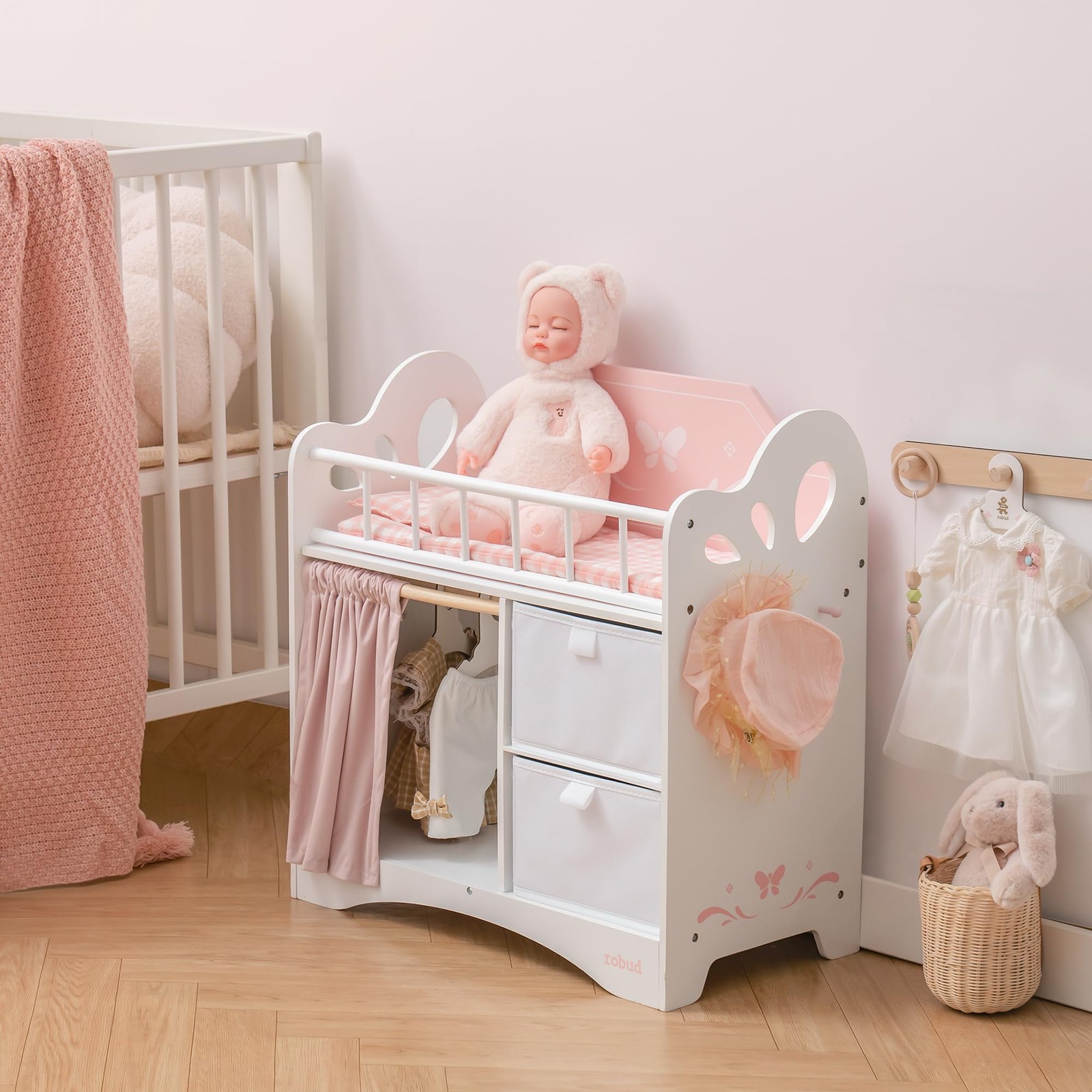 как выглядит Baby Doll Crib, Wooden Doll Bed with Storage and Bedding, of Toy Baby Crib to... фото