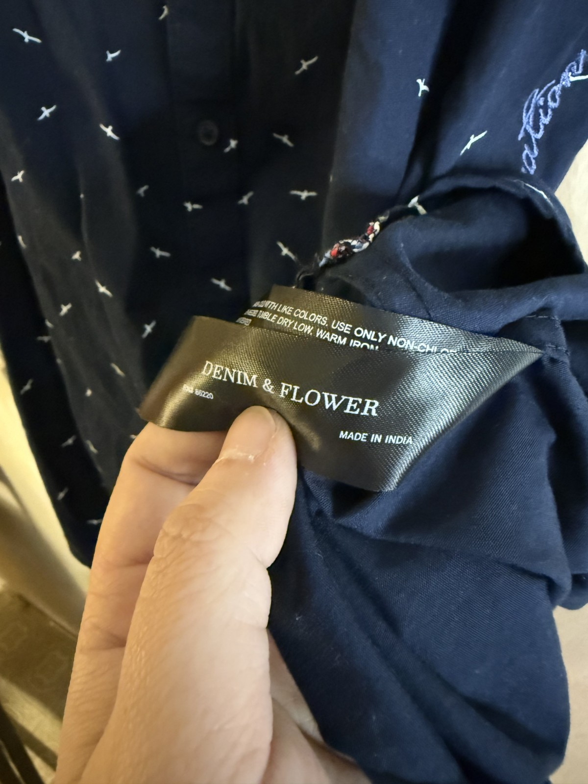Denim Flower Ricky Singh NWT Shirt L Navy Bird Print Short Sleeve Button Up