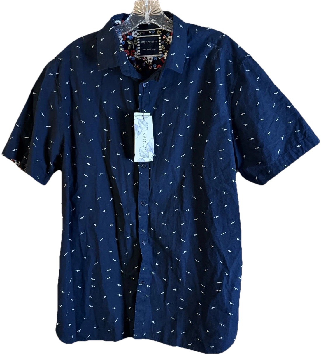 как выглядит Denim Flower Ricky Singh NWT Shirt L Navy Bird Print Short Sleeve Button Up фото