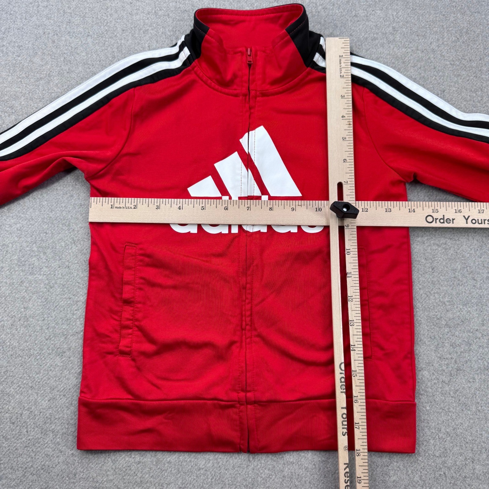 как выглядит Boys Adidas Track Jacket Red White Black Logo Full Zip Size 5 Three Stripe фото