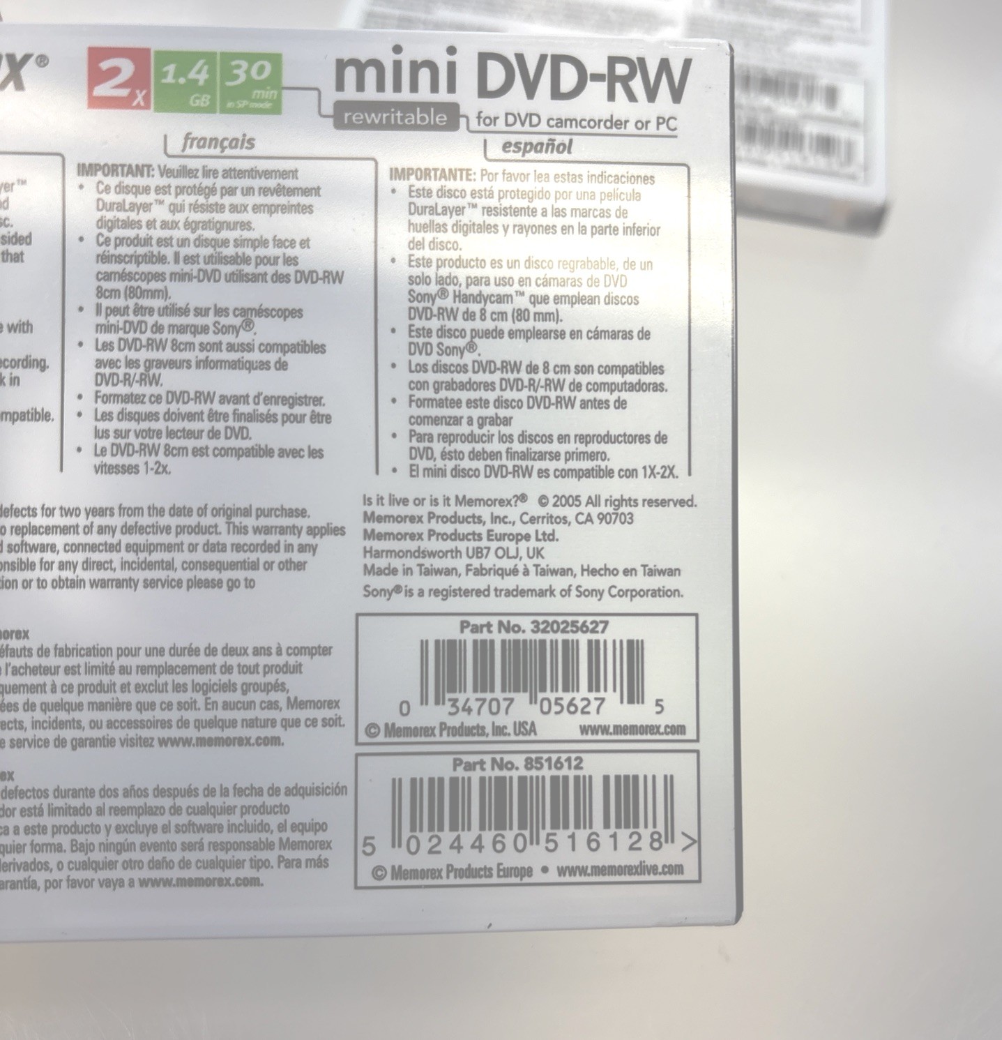 New Lot 2 Memorex Mini DVD-RW Recordable DVD Camcorder PC 1.4 GB 30 Min Sealed