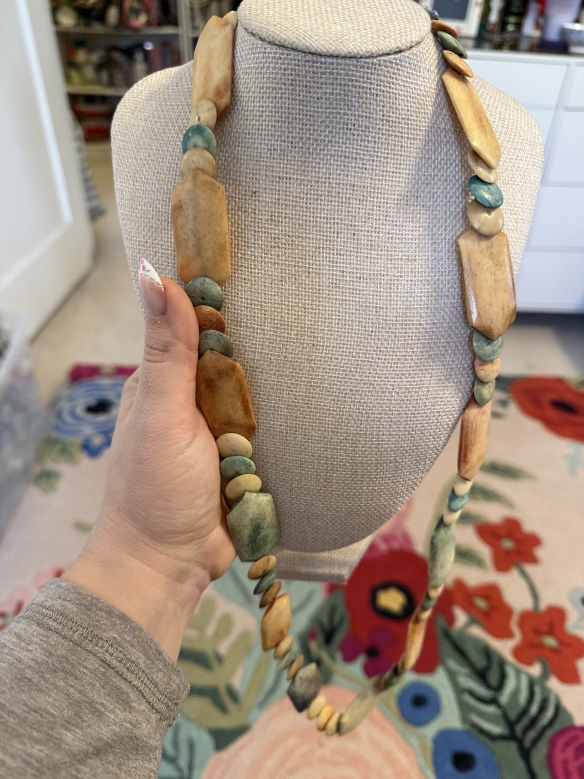 Long Multicolor Tan And Turquoise Flat Beaded Statement Necklace Boho Chic