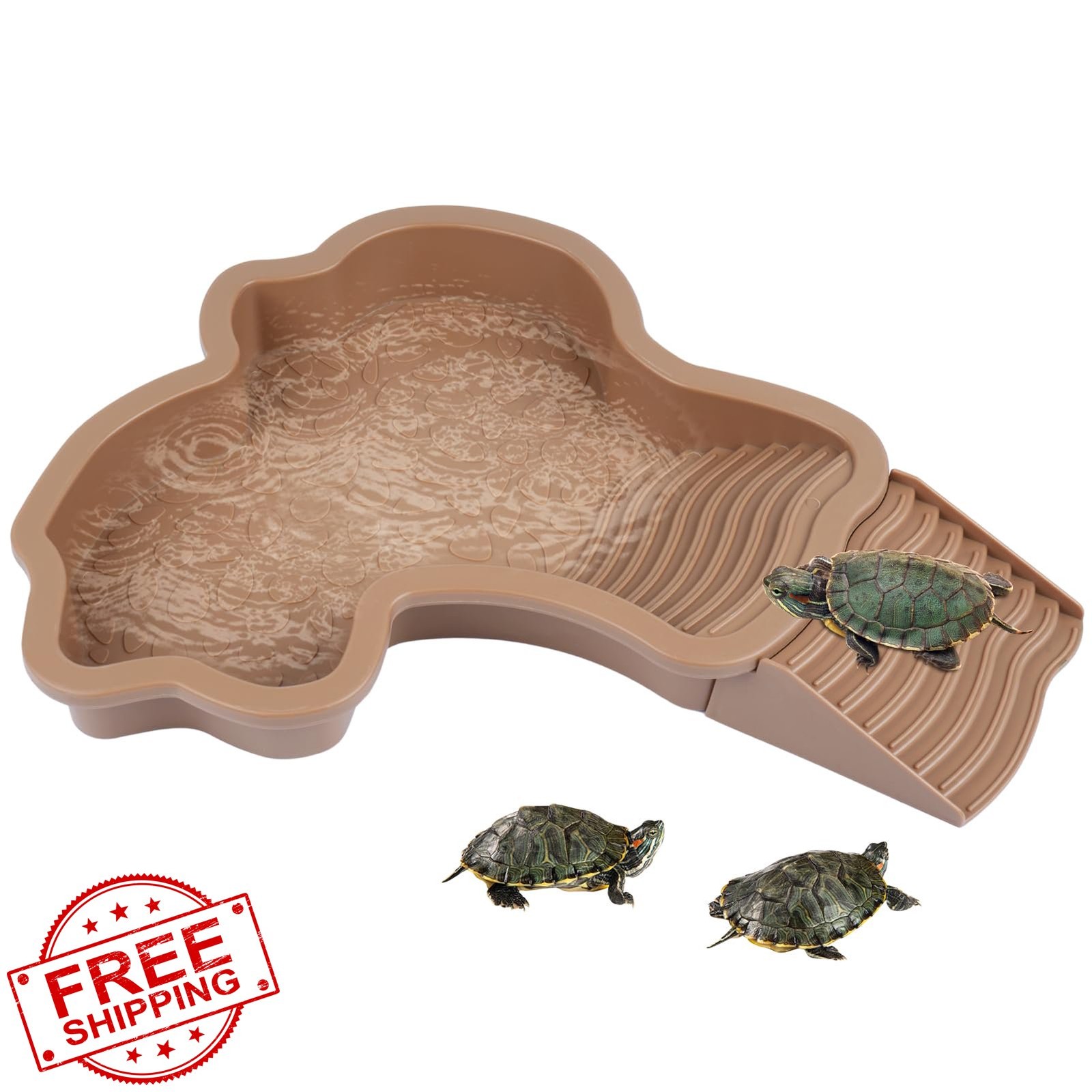 Reptile Bath Pool Tortoise Food Water Bowl w/ Ramp Aquarium Ornament