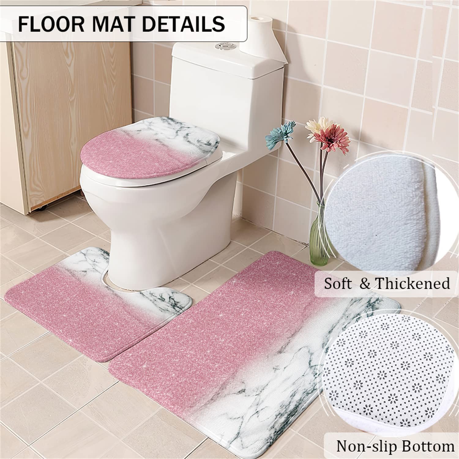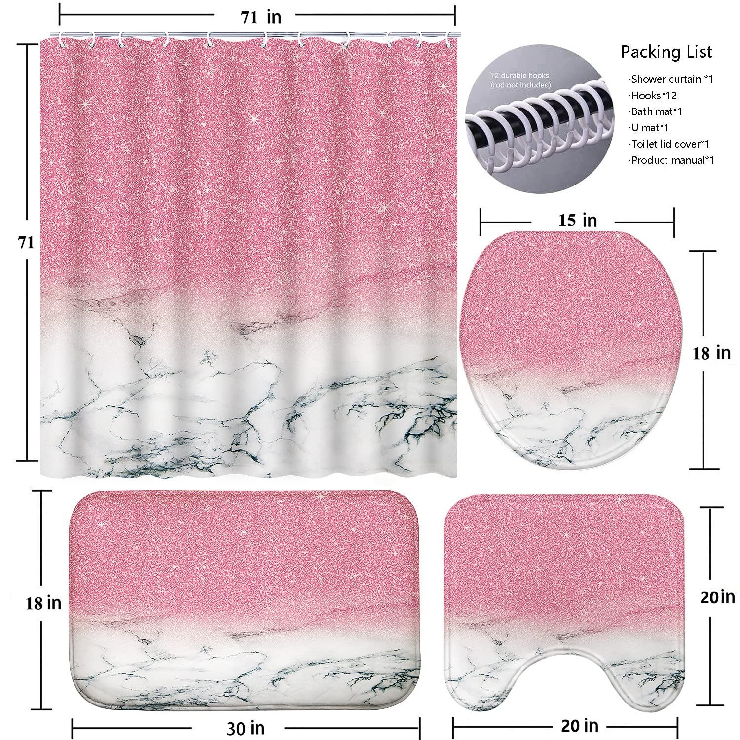 4 Piece Bathroom Shower Curtain Set with Rugs, Pink Marble Shower Curtain Set...