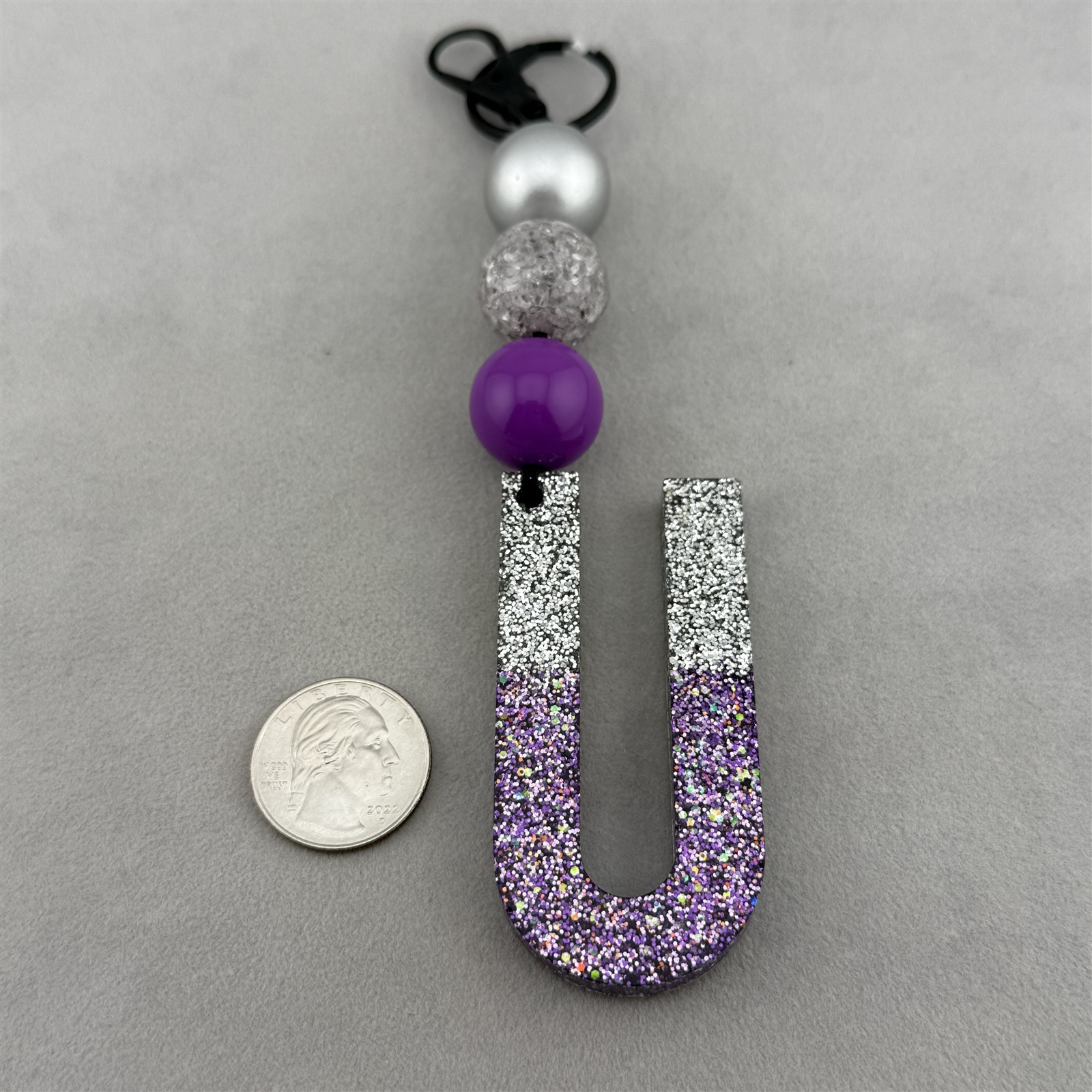 • U Letter Initial Purple Silver Glitter Resin 5" Long Keychain Purse Charm 62776