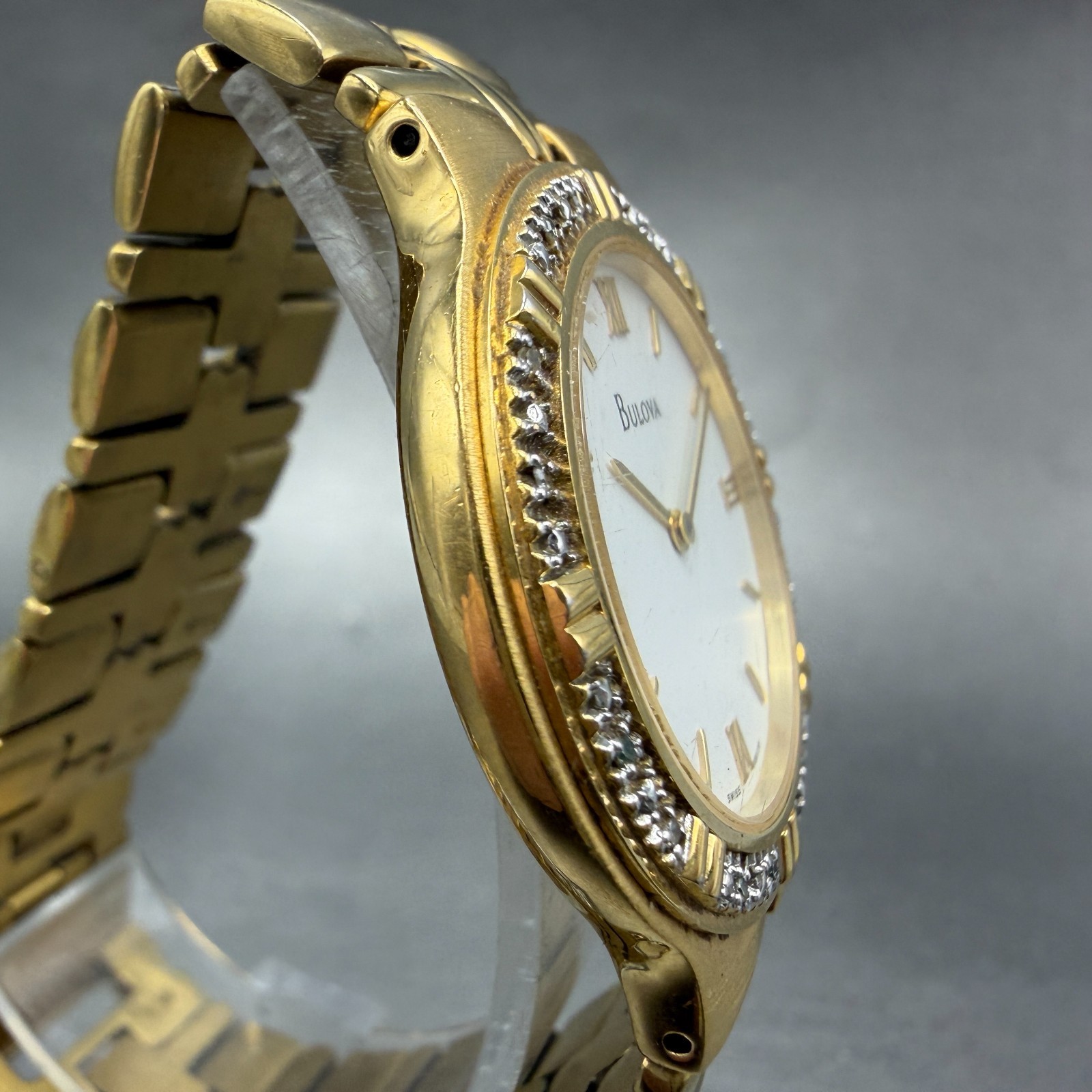 Bulova Watch Men 34mm White Dial Gold Tone Diamond Bezel Round 98E05 New Battery