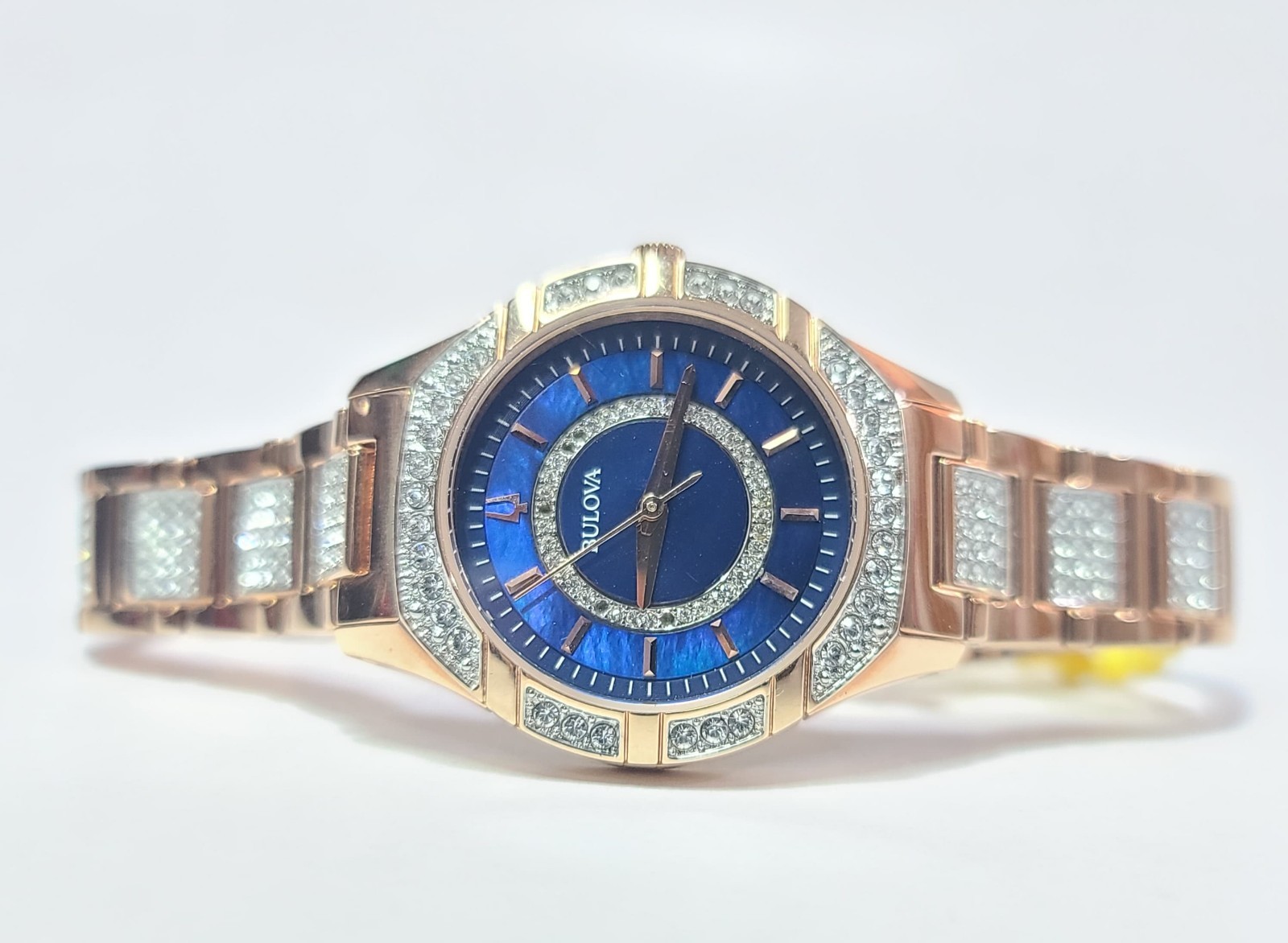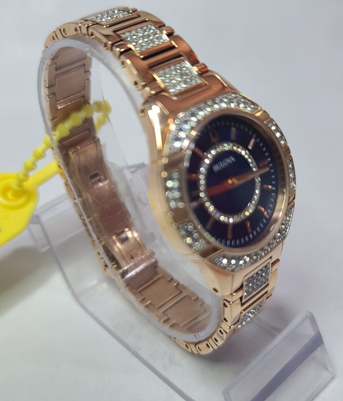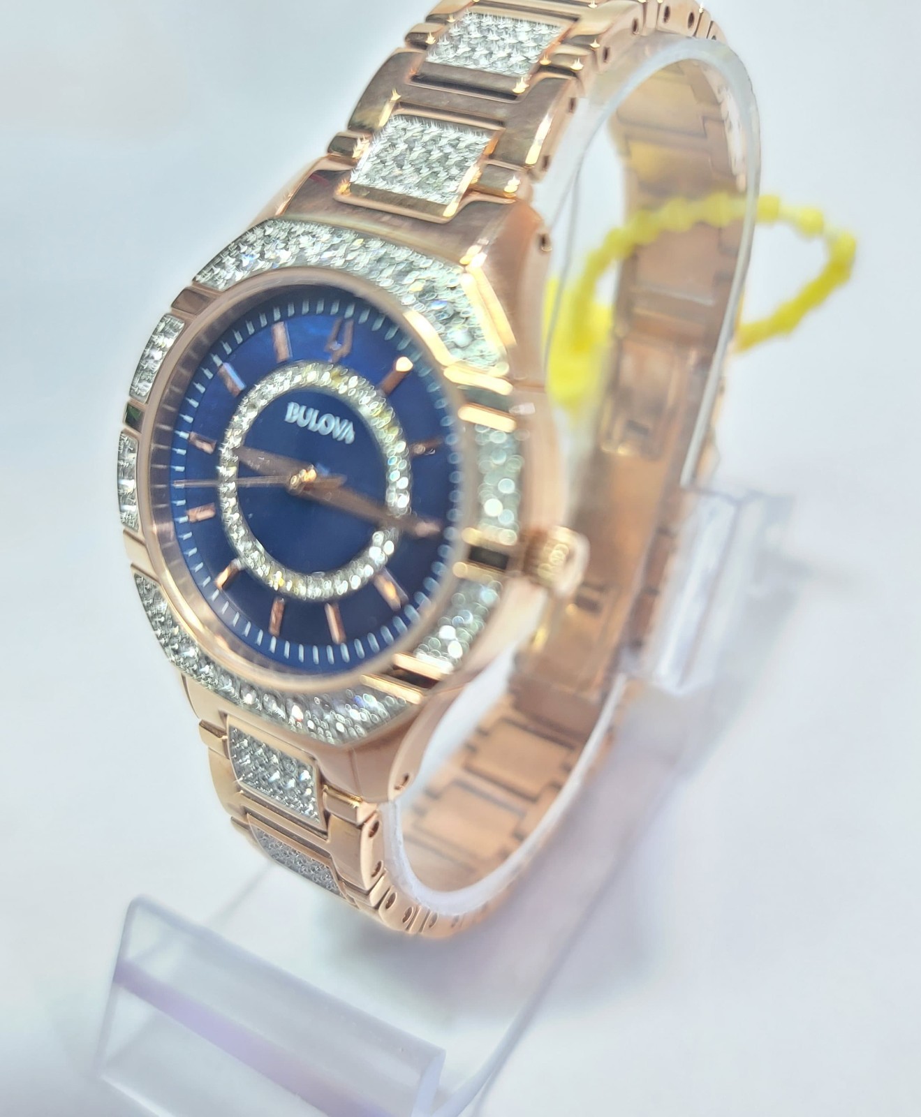 BULOVA BLUE DIAL DIAMOND ACCENT ROSE GOLD WATCH FOR WOMEN'S MB-659
