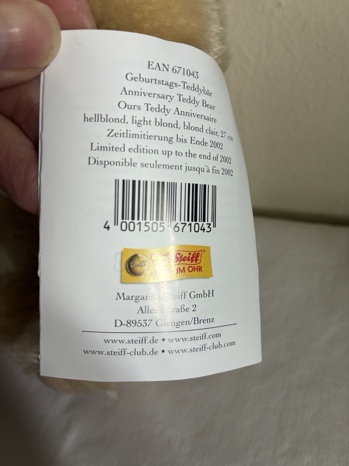 как выглядит Steiff 100 Year Anniversary Teddy Bear 10" Blond Mohair 2002 Germany 671043 Tags фото