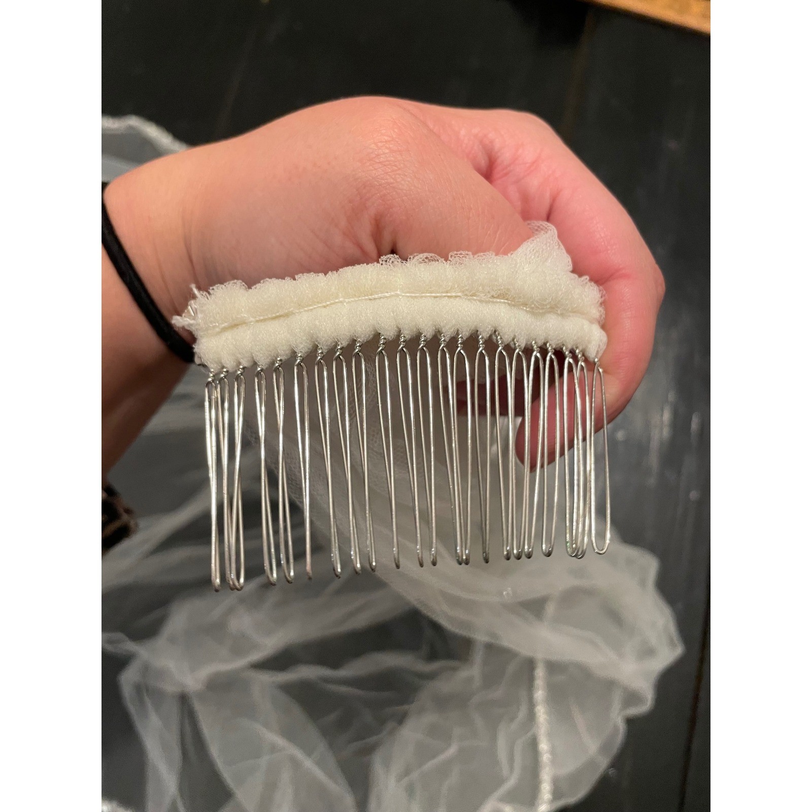как выглядит White Tulle Bridal Veil with Pearl and Crystal Beaded Edge Metal Comb Accessory фото