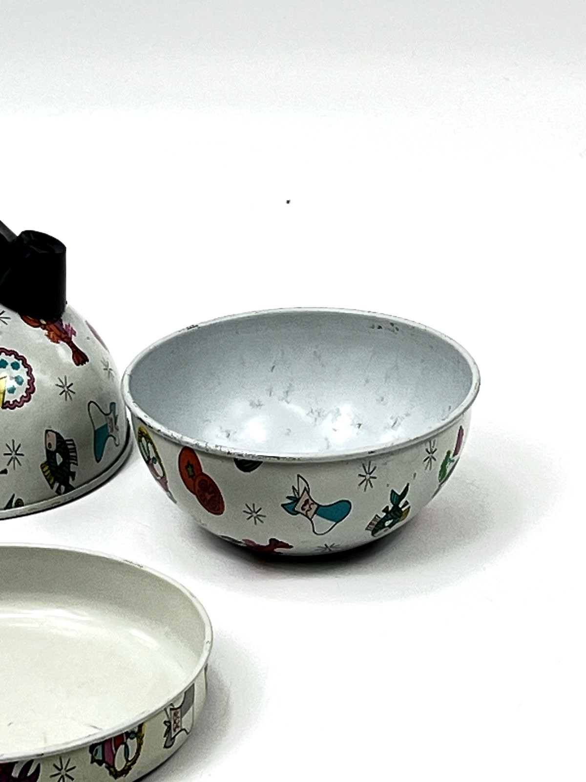 как выглядит Vintage Tin Toy Pans Kettle Bowl MCM Food Chef Meat Childs Cook Dishes - 4 Pc фото