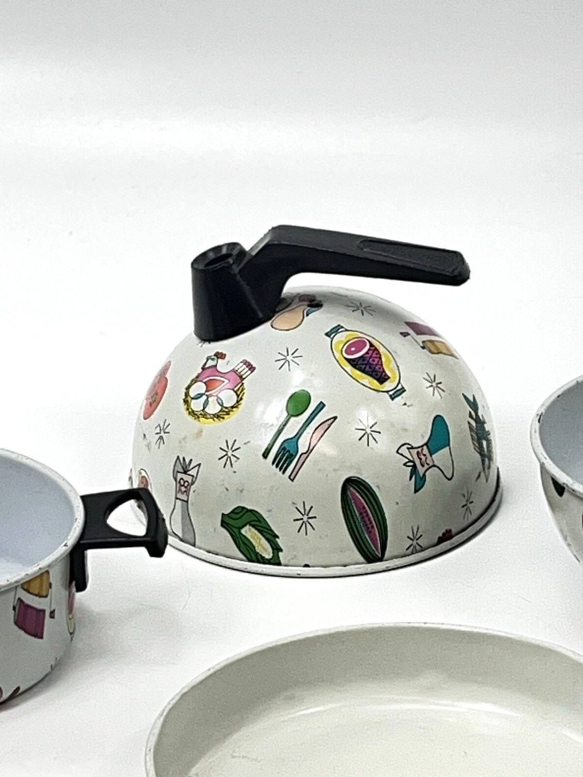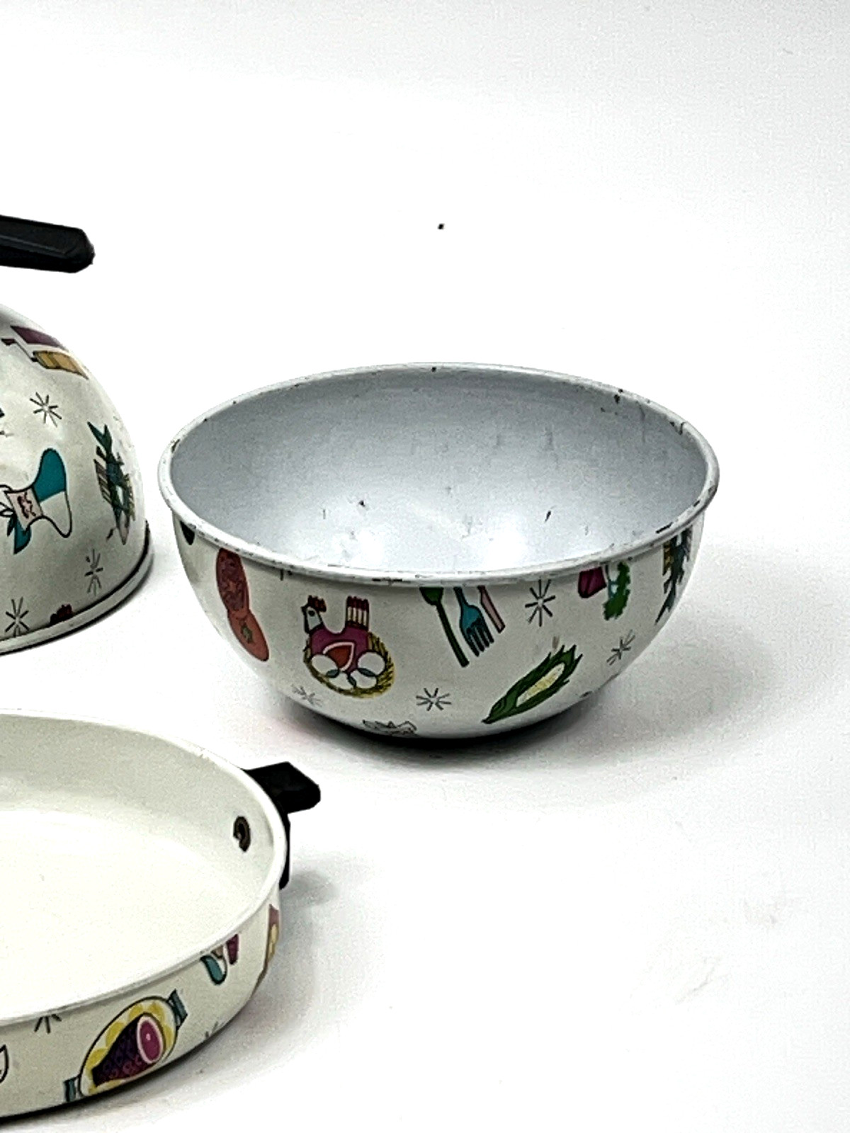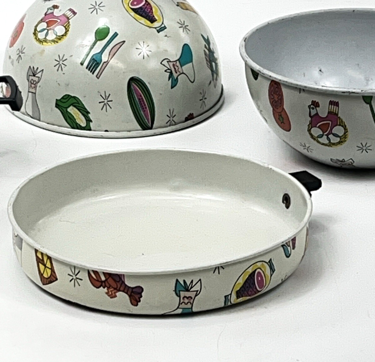 как выглядит Vintage Tin Toy Pans Kettle Bowl MCM Food Chef Meat Child