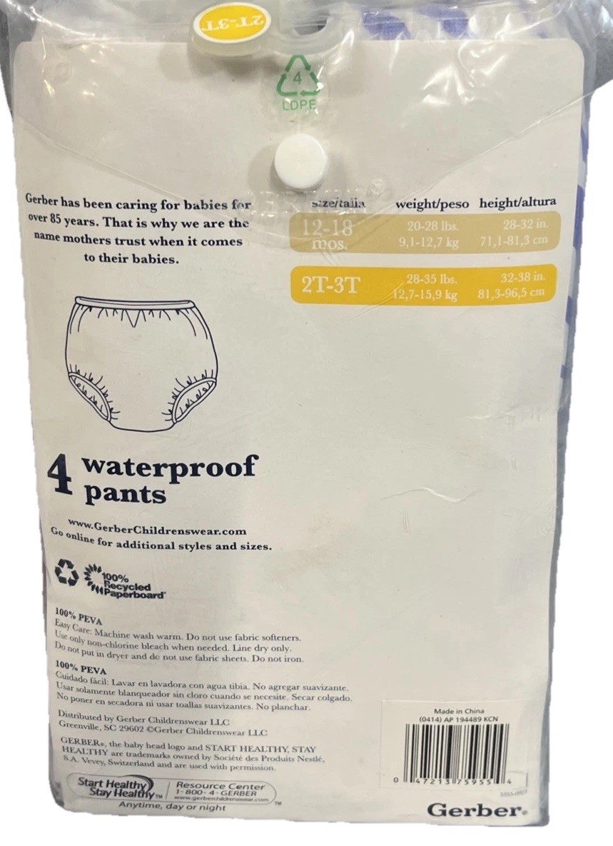 Gerber Waterproof Pants Baby Toddler 2T-3T 28-35 lbs 4 Pack NEW