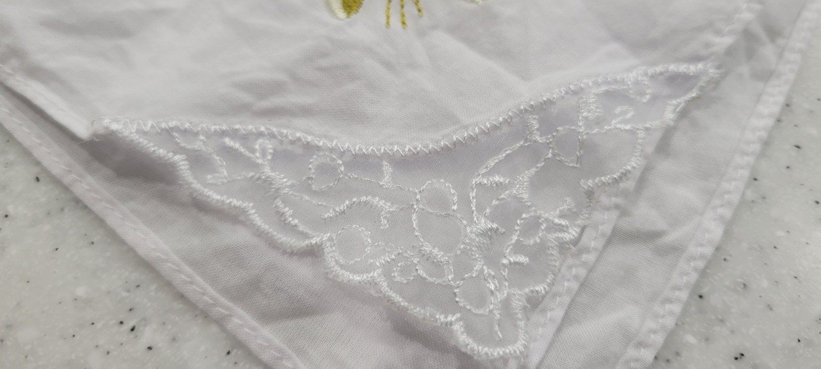 как выглядит 3 Beautiful VTG Ivory Floral Lace Border Linen Wedding Hankies, EUC,SEE LAST PIC фото