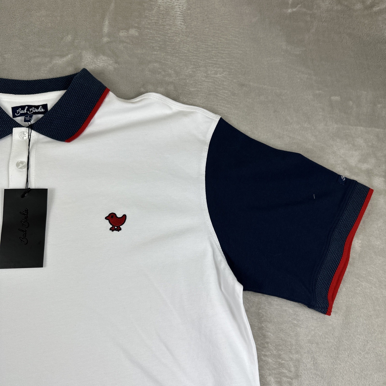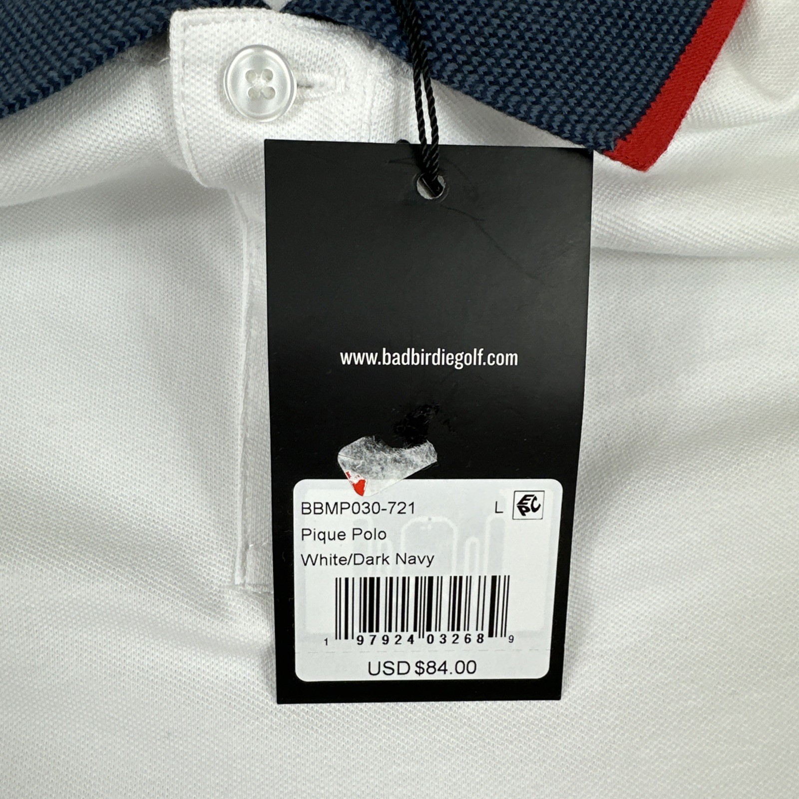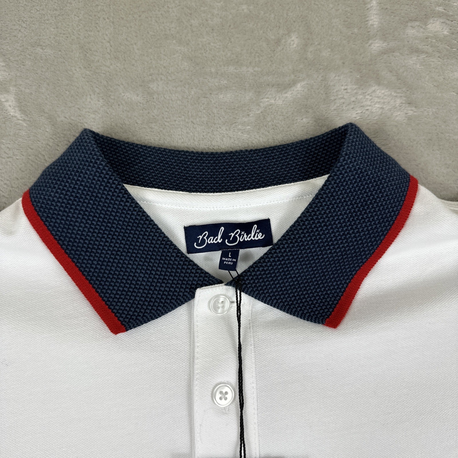 Bad Birdie Pique Golf Polo White Dark Navy Red Shirt Short Sleeve USA Men's L