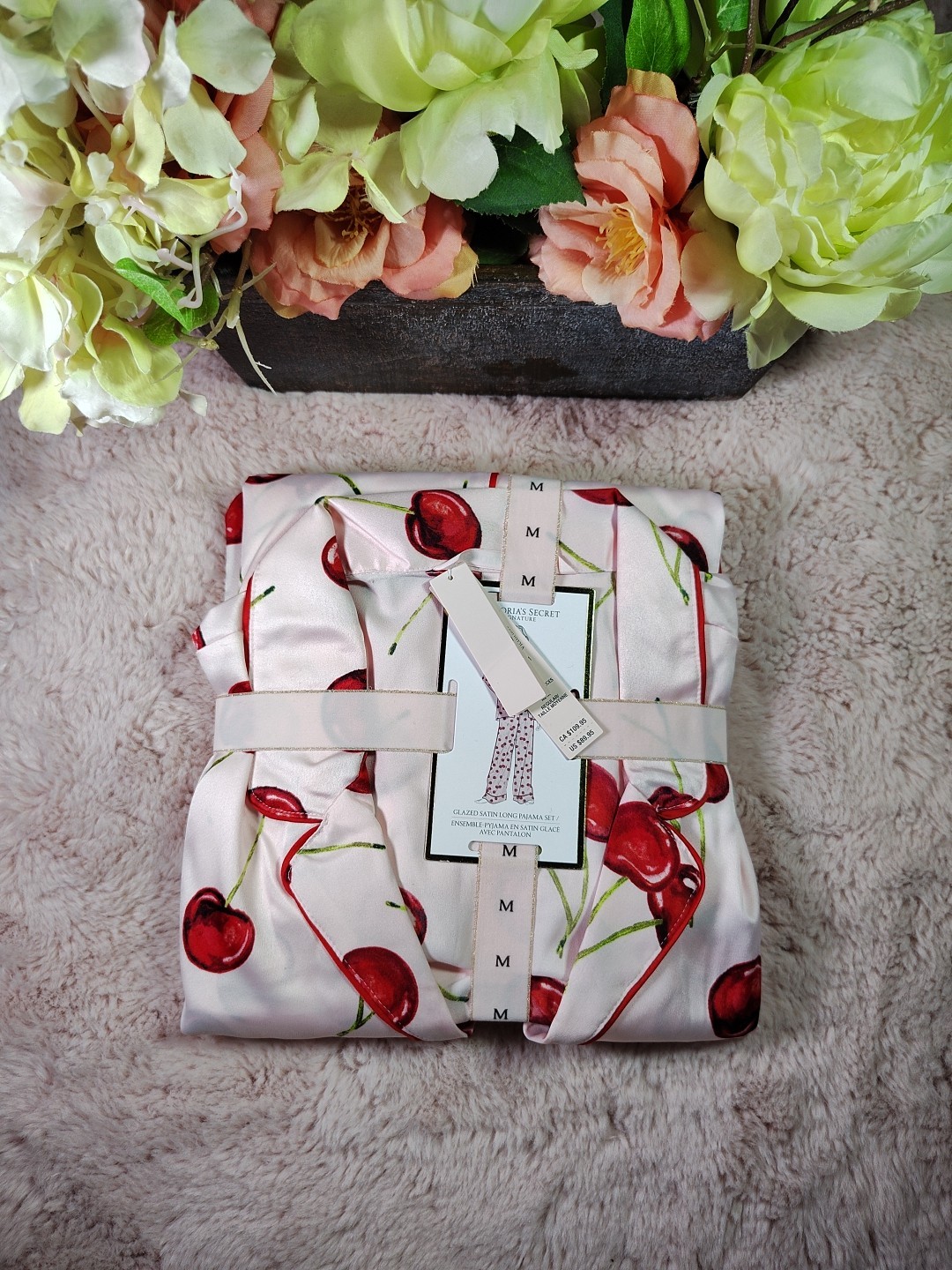 90 Victoria's Secret Glazed Satin Cherry Print PJ Set Medium Regular