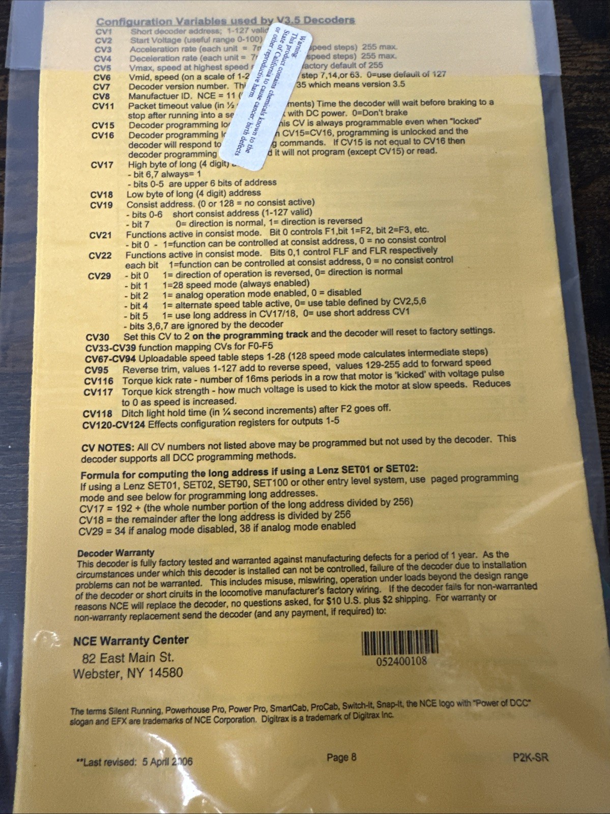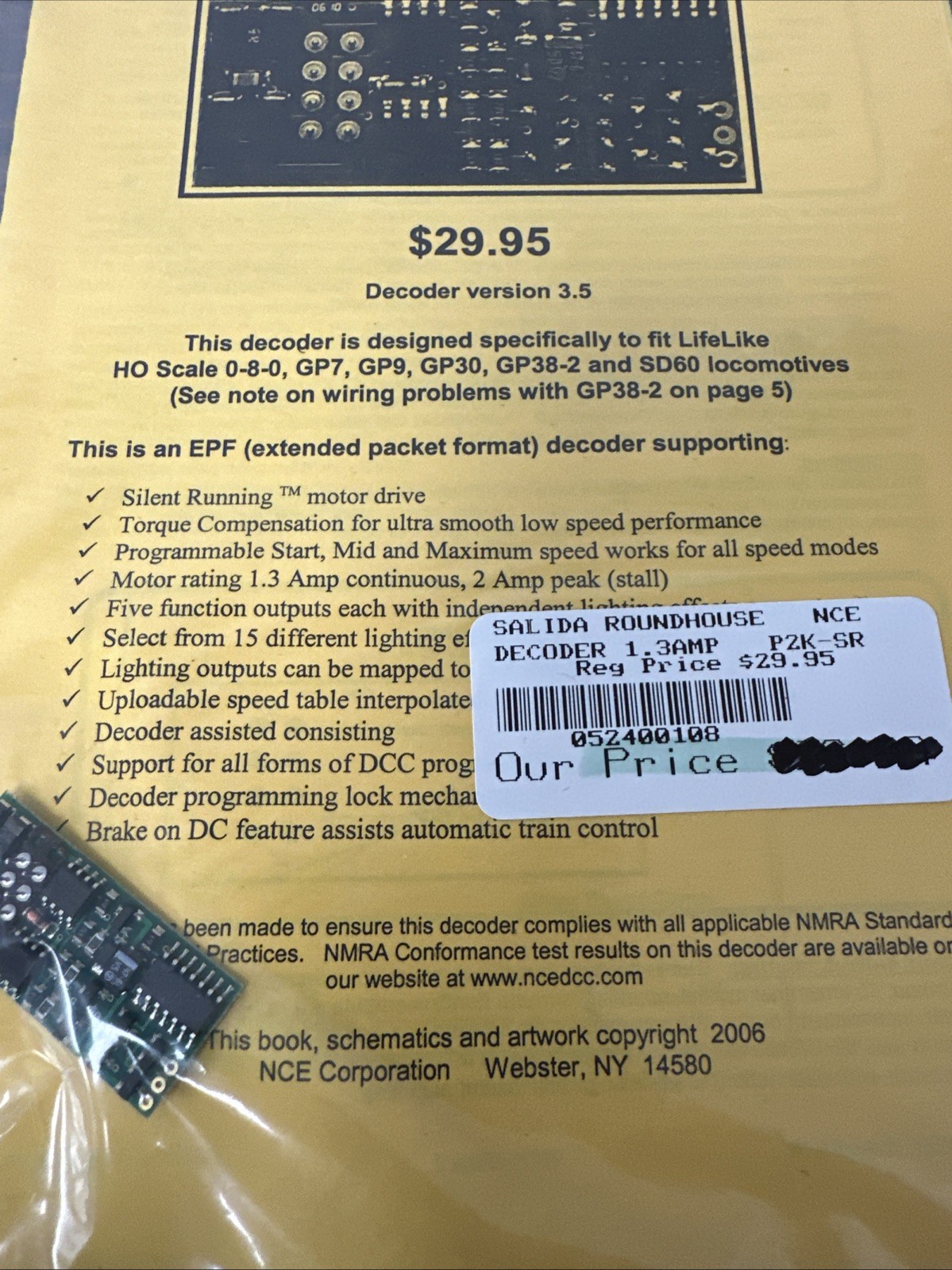 NCE HO Scale P2K-SR DCC Decoder Version 3.5 for Life-Like Locomotives NIP