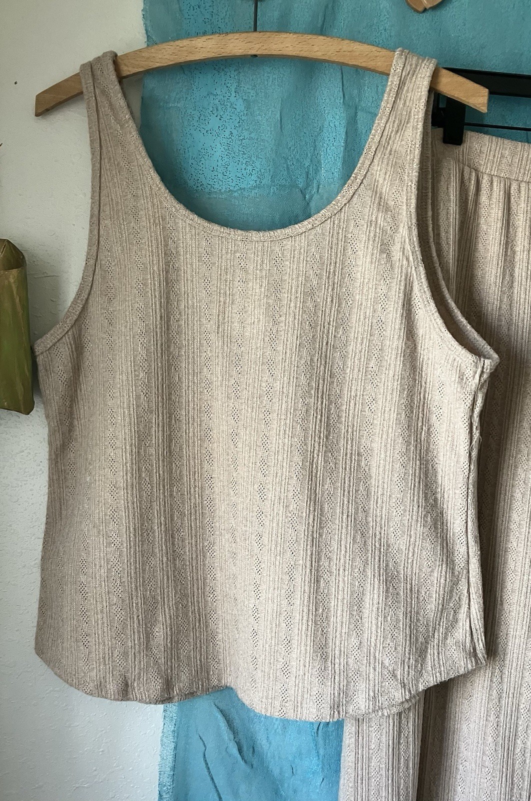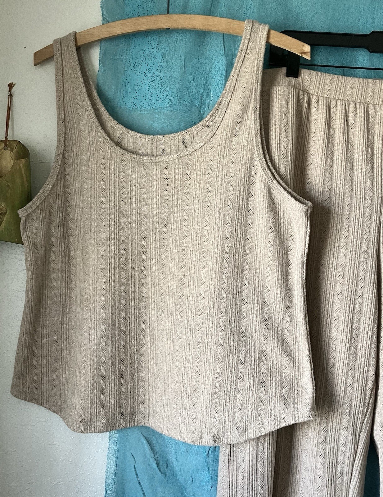 Особенности: Lightweight, All Seasons, Pockets on the Pants, V-Neck Cardigan, Wide-Leg Pants, Scoop Neck Tank Top, Elastic Waist on the Pants, Textured Knit, Beige Color, Stretchy, very soft pocket insides, Rouned Hem at the bottom of the Tank Top