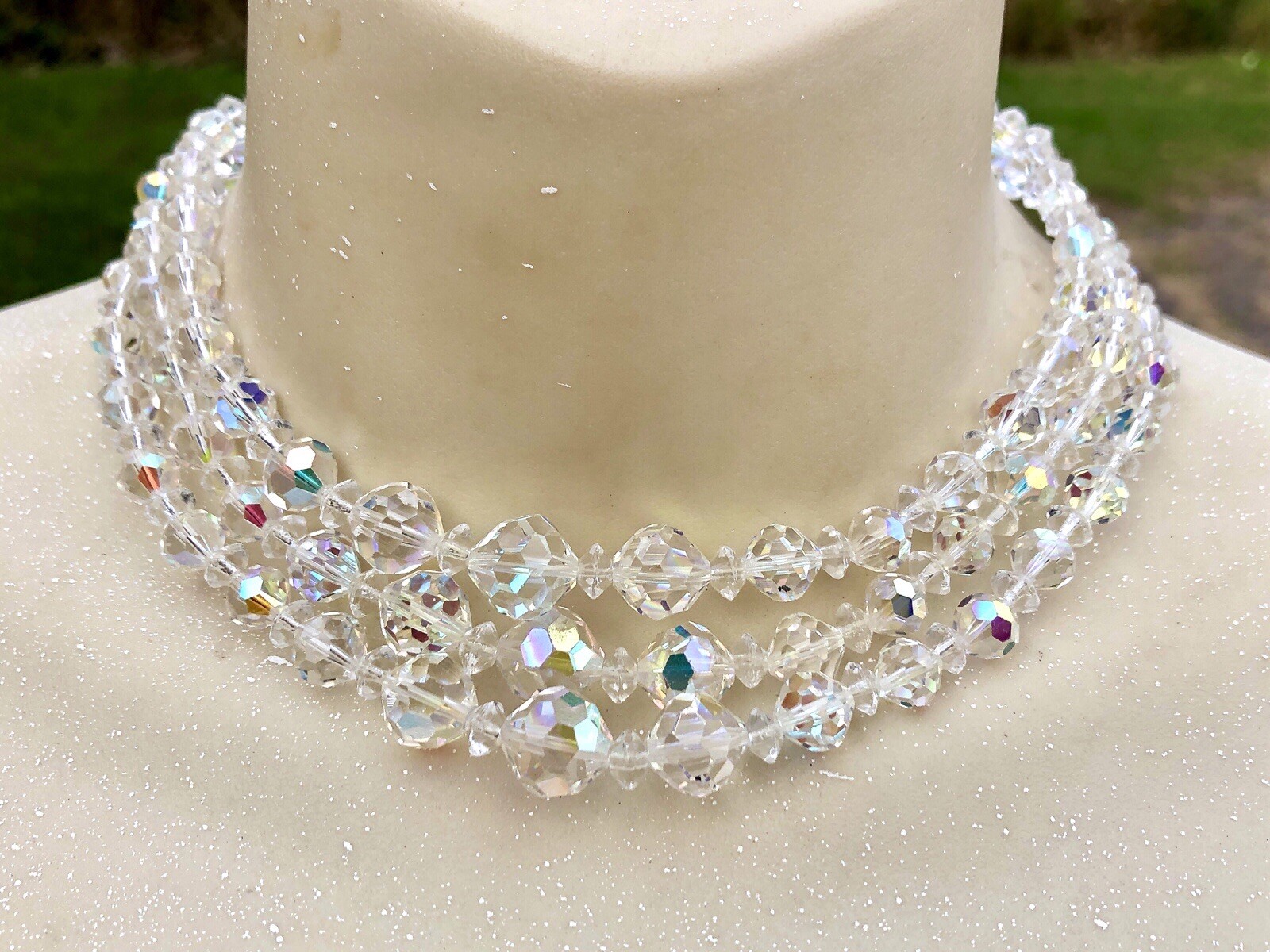 Vtg Triple Strand Graduated AB Aurora Borealis Crystal Choker Necklace 1950 14