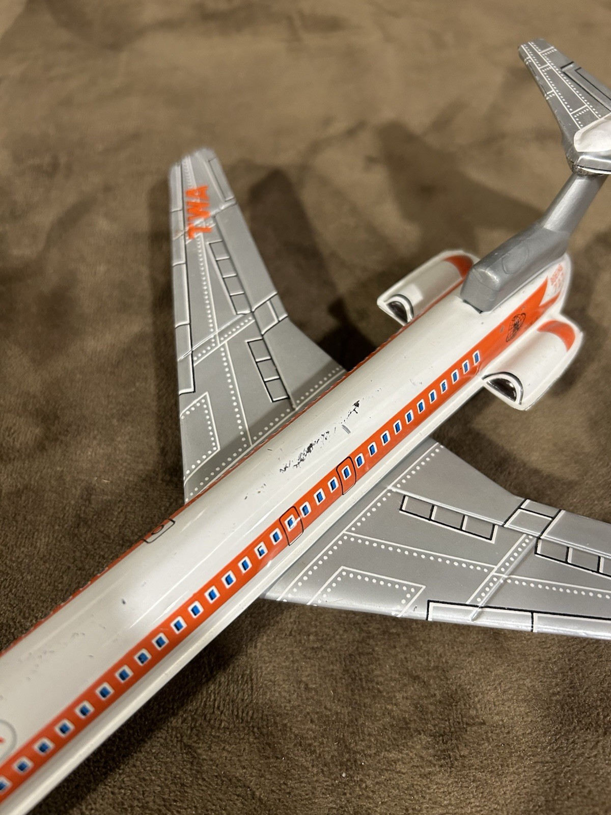 Vintage Japan Tin Friction TWA Boeing 727 Airplane