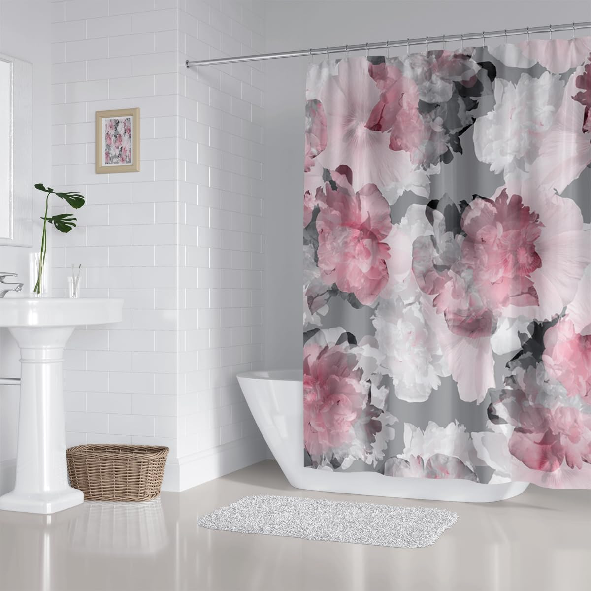Pink Grey Floral Shower Curtain 72x60 Inches Waterproof Polyester with 12 Hooks