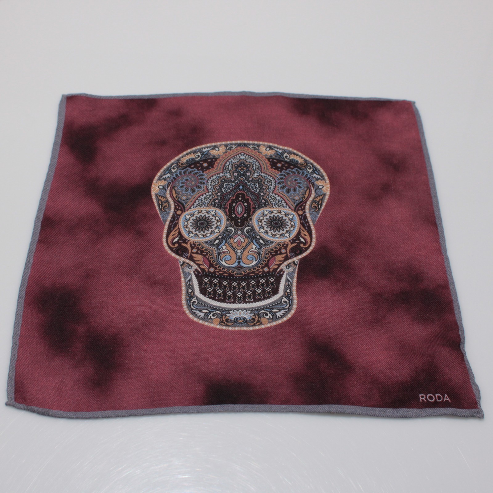 Roda NWT Wool / Silk Blend Pocket Square In Red Black with Skull Graphic