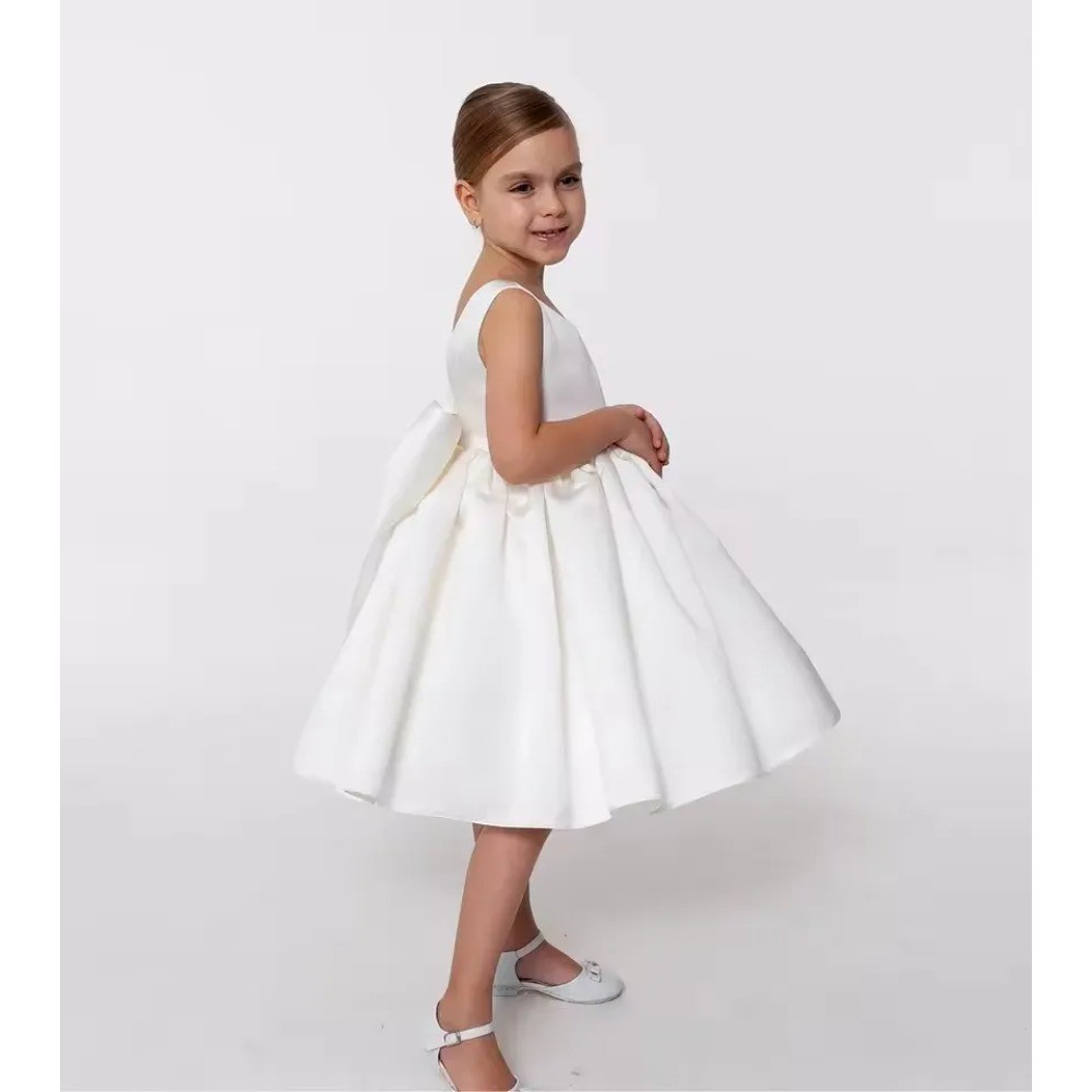 White Satin Flower Girl Dress For Wedding Party Bow Puffy Skirt Jewel Neck Gowns