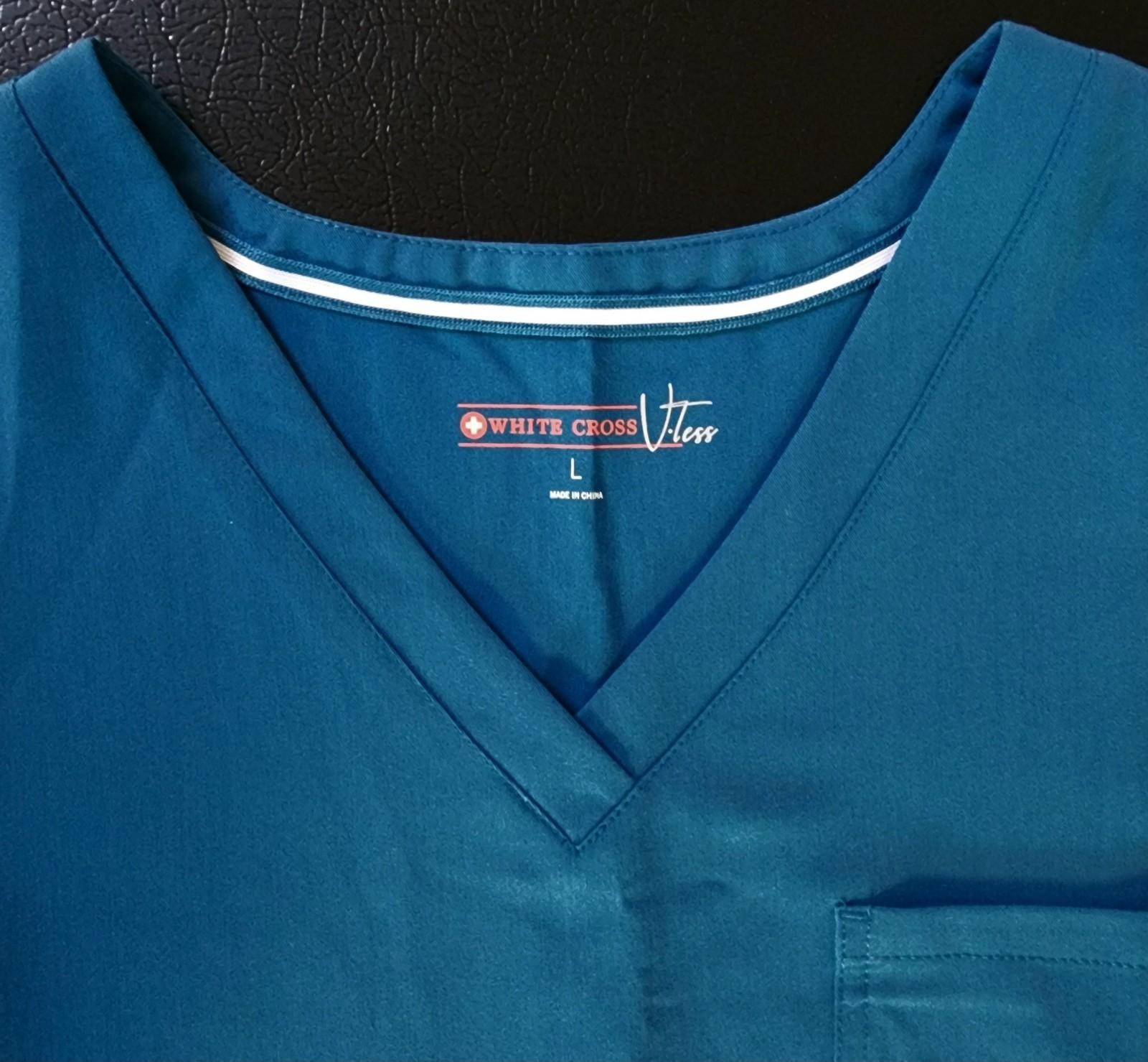 NEW Women's Scrub Top Large V Neck Lyons Blue Luxury Stretch White Cross Fit