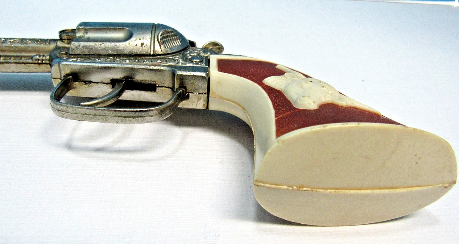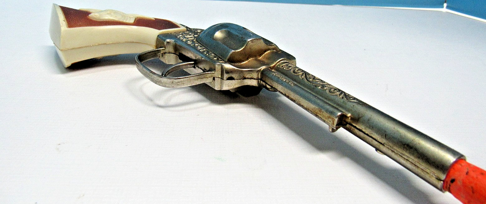 как выглядит VINTAGE 1960s GABRIEL 9 1/2" DIE CAST GOLD-WASH CAP GUN W/ EMBOSSED STEER GRIPS фото