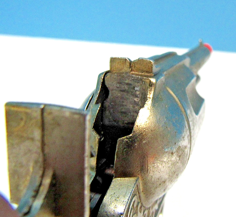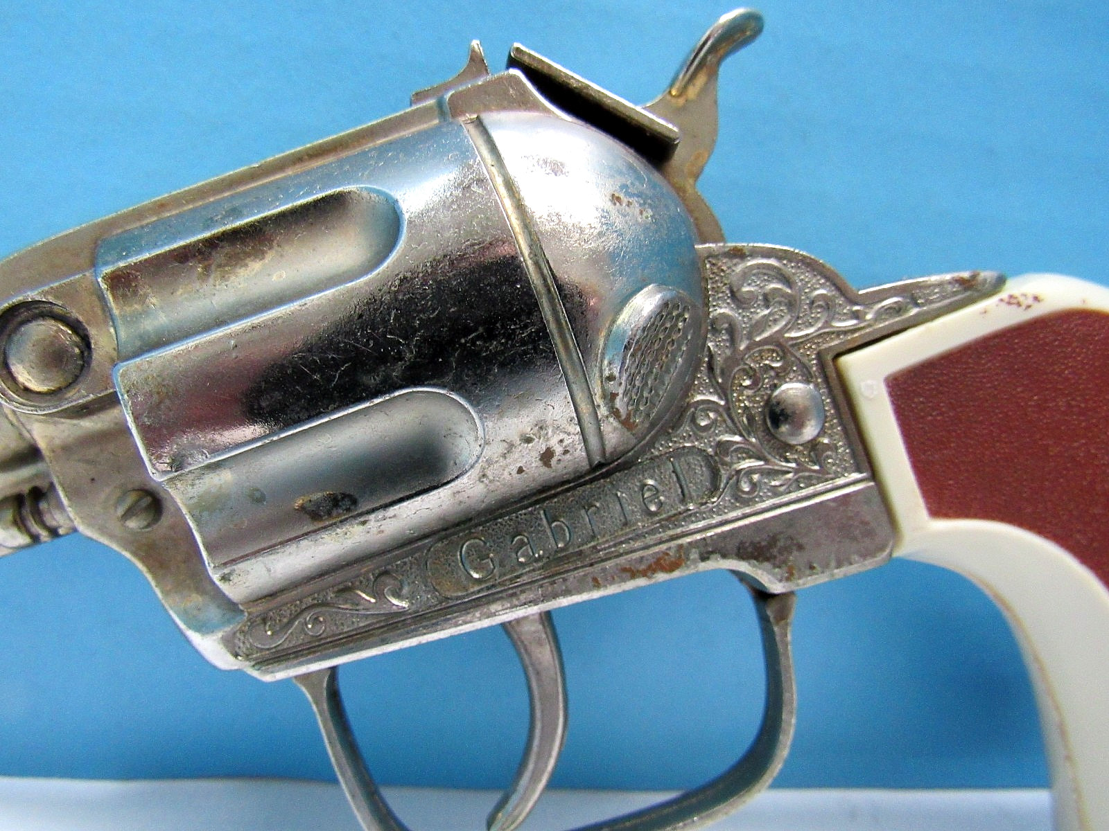 VINTAGE 1960's GABRIEL 9 1/2 DIE CAST GOLD-WASH CAP GUN W/ EMBOSSED STEER GRIPS