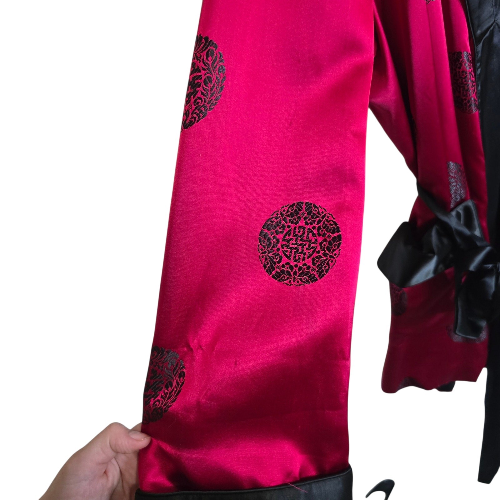 как выглядит Vintage 60s Red Satin Smoking Jacket - MCM Chinese Medallion Lounge Robe Size L фото