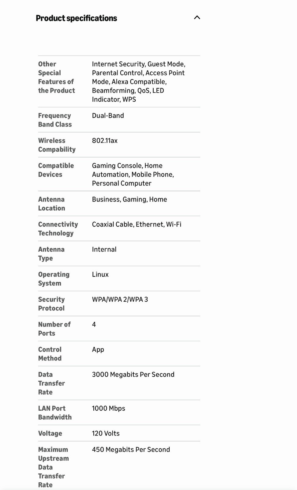 Connectivity: Wireless-Wi-Fi 802.11ax, Wired-Ethernet (RJ-45), Coaxial Cable