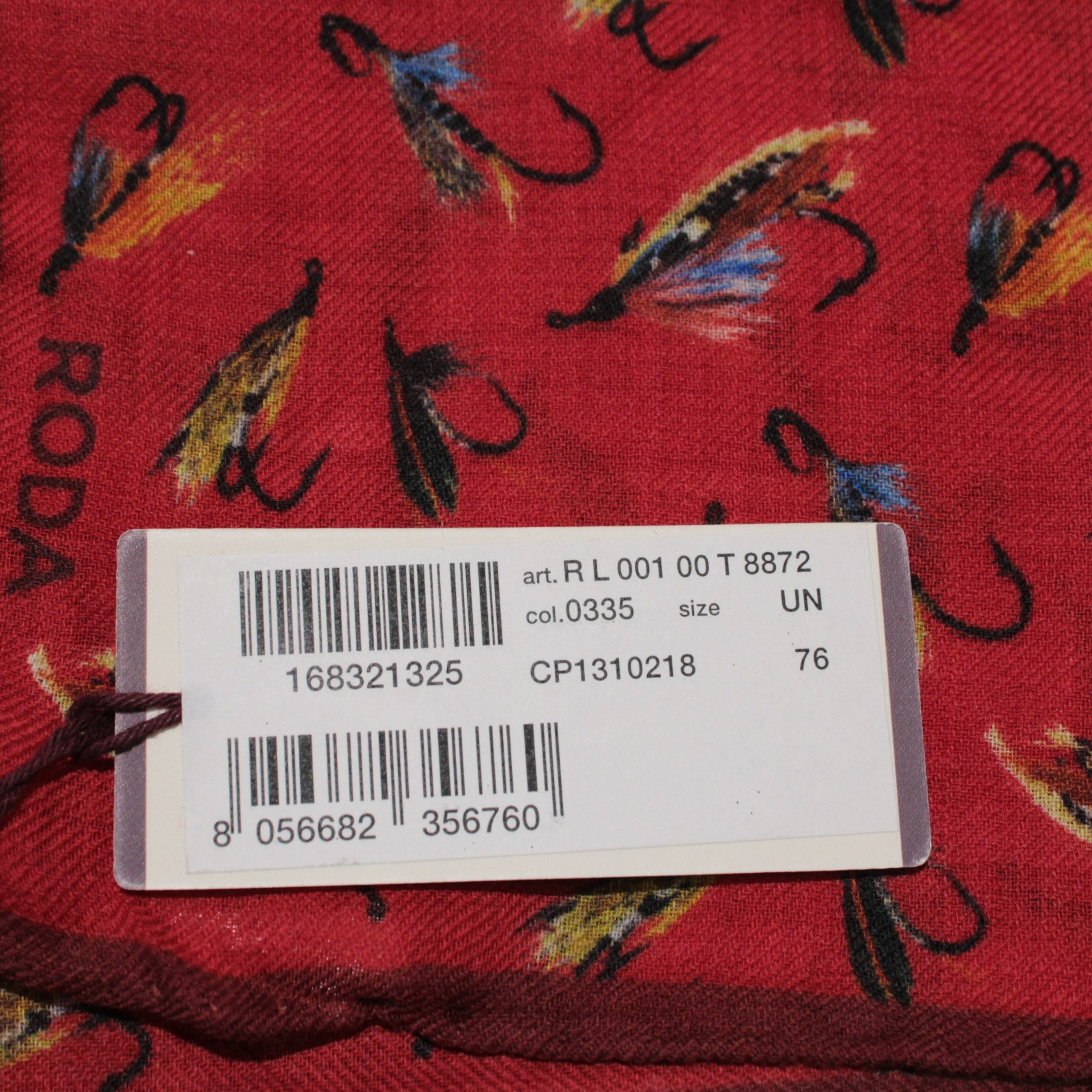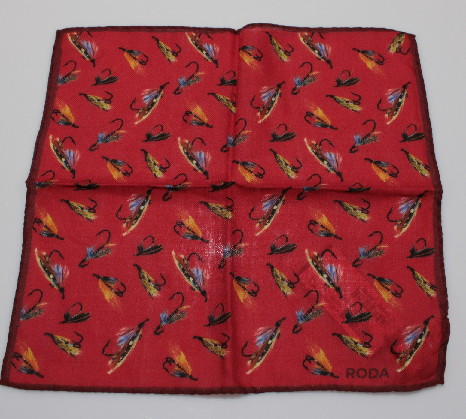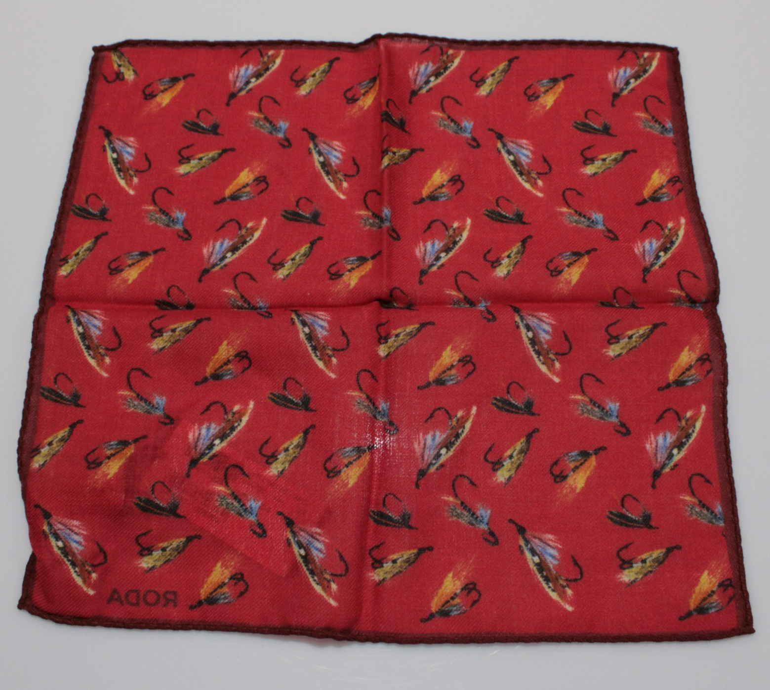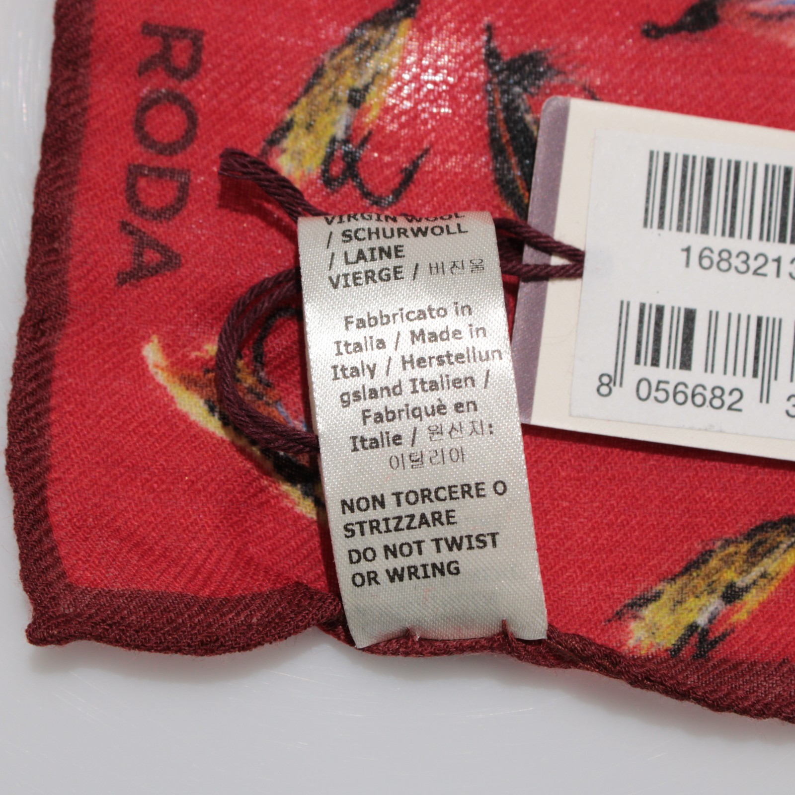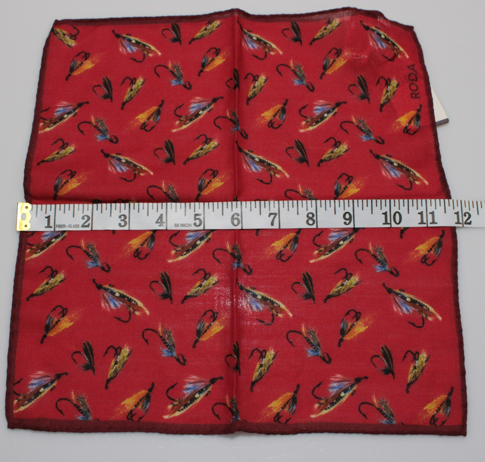 Roda NWT 100 Wool Pocket Square In Red w/ Multicolor Fishing Lures