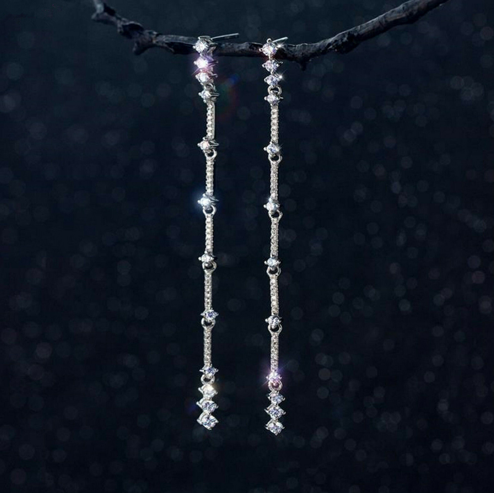 Sterling Silver Long Paved CZ Drop Dangle Party Bridal Post Earrings