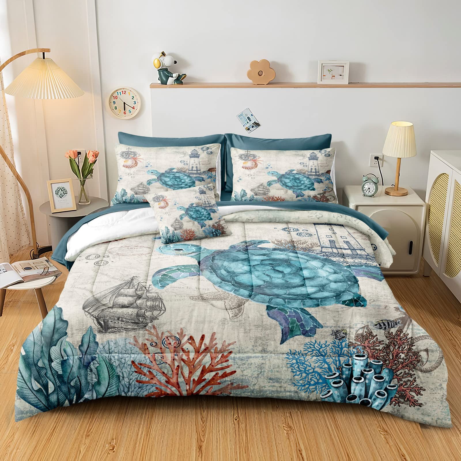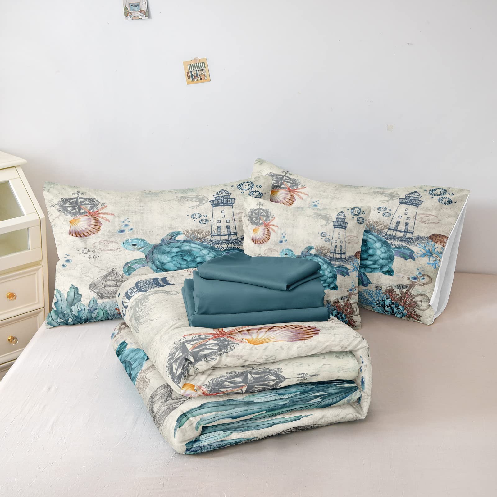 как выглядит Turtle Comforter Set Ocean Turtle Bed in a Bag 8 Pieces Coastal Beach Themed ... фото