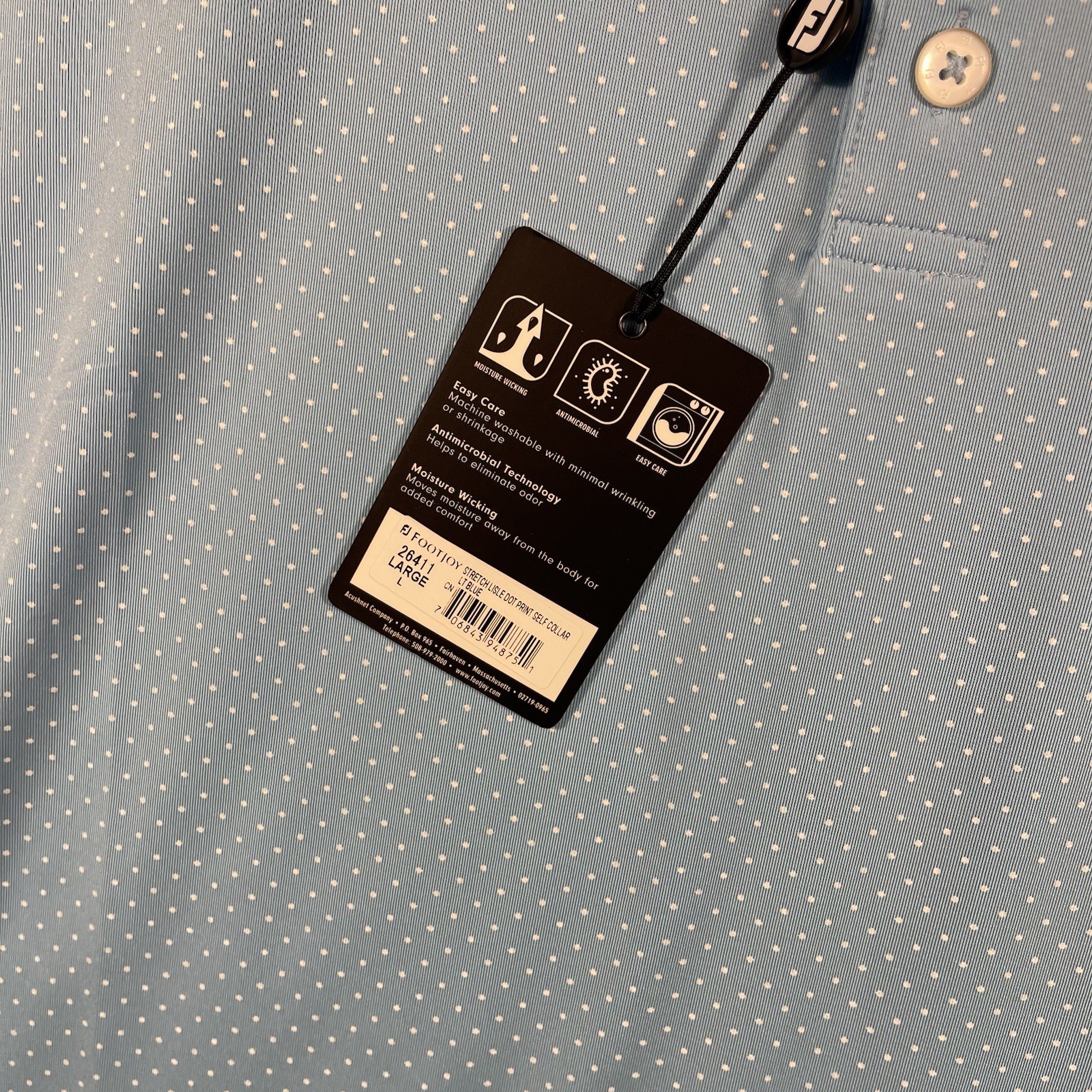 как выглядит FootJoy Polo Shirt Mens Large Blue Dot Print Lisle Golf Performance Stretch NWT фото